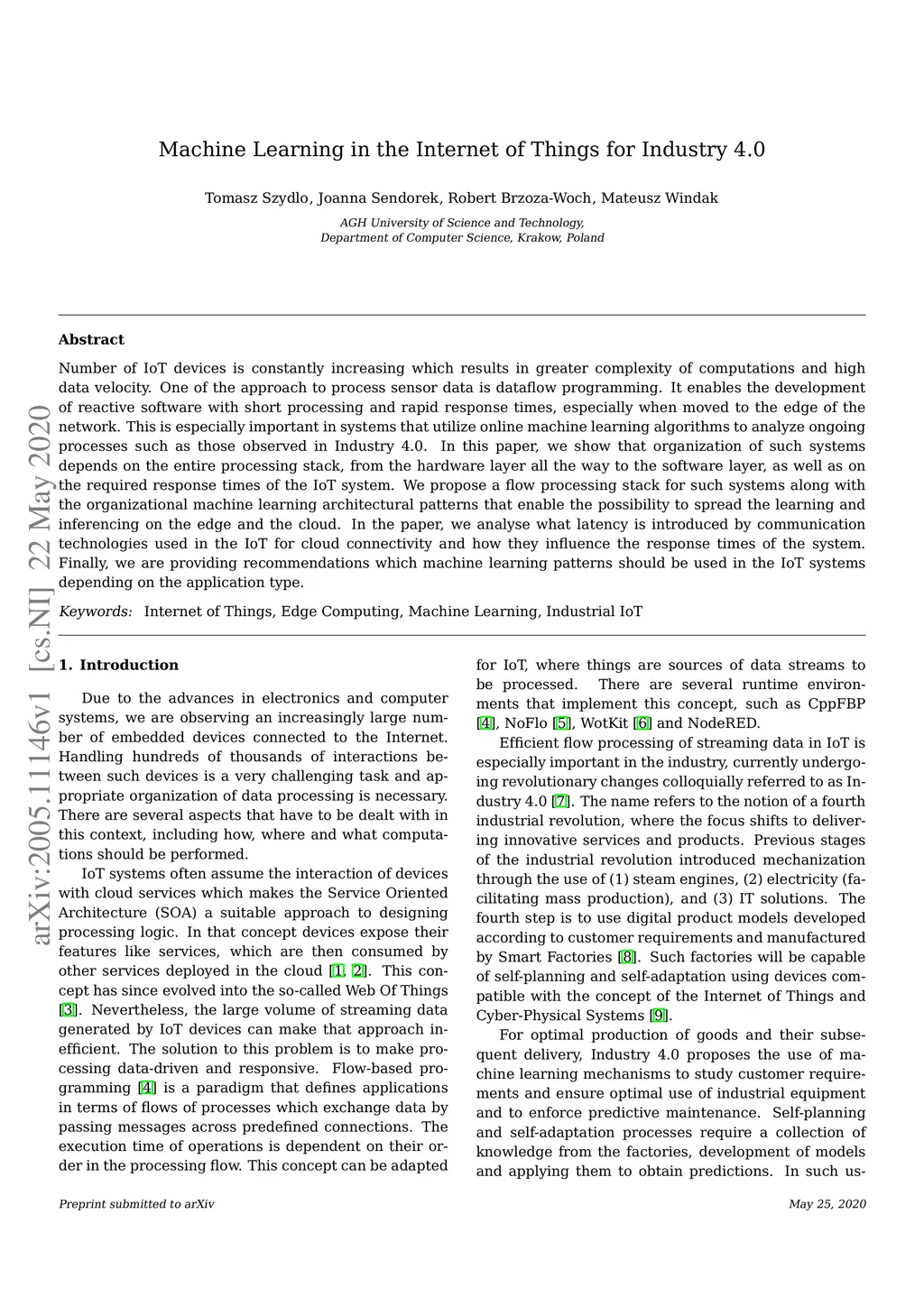 Number of IoT devices is constantly increasing which results in greater complexity of computations and high data velocity. One of the approach to process sensor data is dataflow programming. It enables the development of reactive software with short processing and rapid response times, especially when moved to the edge of the network. This is especially important in systems that utilize online machine learning algorithms to analyze ongoing processes such as those observed in Industry 4.0. In this paper, we show that organization of such systems depends on the entire processing stack, from the hardware layer all the way to the software layer, as well as on the required response times of the IoT system. We propose a flow processing stack for such systems along with the organizational machine learning architectural patterns that enable the possibility to spread the learning and inferencing on the edge and the cloud. In the paper, we analyse what latency is introduced by communication technologies used in the IoT for cloud connectivity and how they influence the response times of the system. Finally, we are providing recommendations which machine learning patterns should be used in the IoT systems depending on the application type.