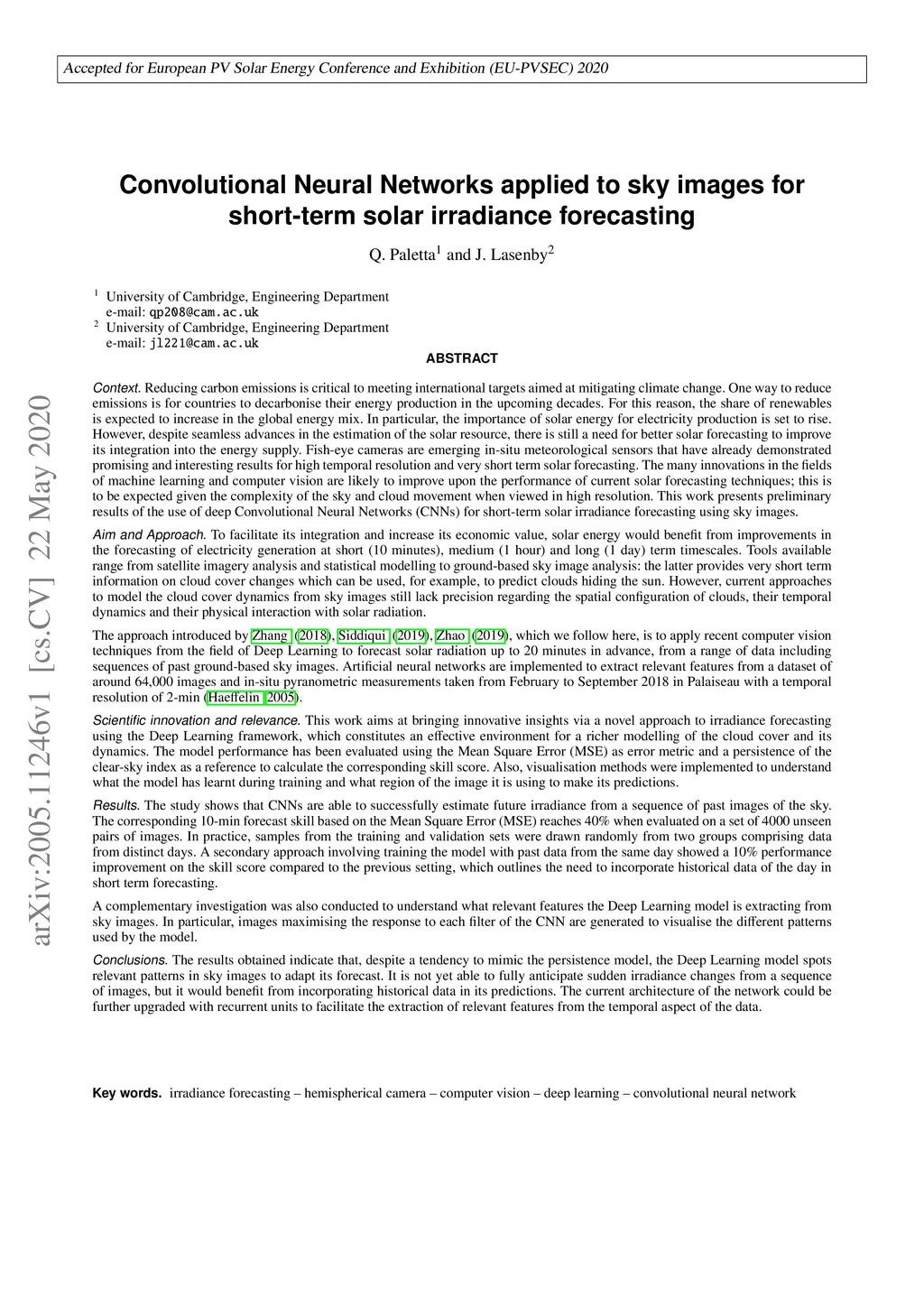Despite the advances in the field of solar energy, improvements of solar forecasting techniques, addressing the intermittent electricity production, remain essential for securing its future integration into a wider energy supply. A promising approach to anticipate irradiance changes consists of modeling the cloud cover dynamics from ground taken or satellite images. This work presents preliminary results on the application of deep Convolutional Neural Networks for 2 to 20 min irradiance forecasting using hemispherical sky images and exogenous variables. We evaluate the models on a set of irradiance measurements and corresponding sky images collected in Palaiseau (France) over 8 months with a temporal resolution of 2 min. To outline the learning of neural networks in the context of short-term irradiance forecasting, we implemented visualisation techniques revealing the types of patterns recognised by trained algorithms in sky images. In addition, we show that training models with past samples of the same day improves their forecast skill, relative to the smart persistence model based on the Mean Square Error, by around 10% on a 10 min ahead prediction. These results emphasise the benefit of integrating previous same-day data in short-term forecasting. This, in turn, can be achieved through model fine tuning or using recurrent units to facilitate the extraction of relevant temporal features from past data.