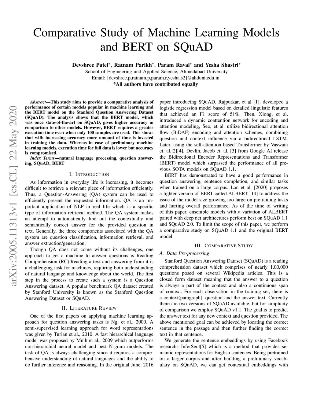 Comparative Study of Machine Learning Models and BERT on SQuAD