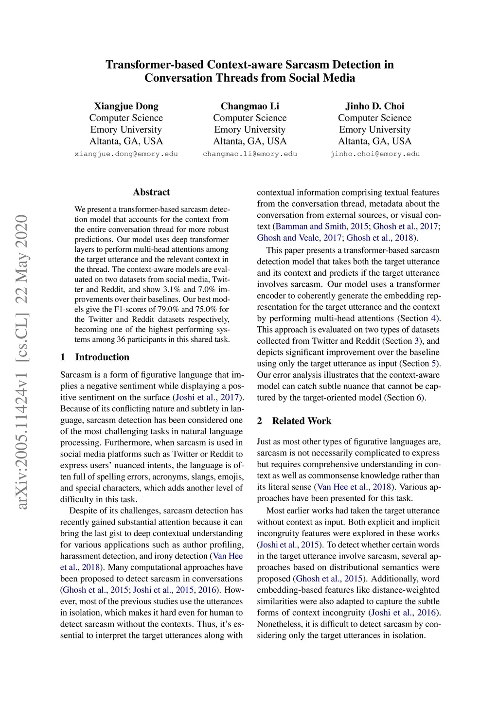 We present a transformer-based sarcasm detection model that accounts for the context from the entire conversation thread for more robust predictions. Our model uses deep transformer layers to perform multi-head attentions among the target utterance and the relevant context in the thread. The context-aware models are evaluated on two datasets from social media, Twitter and Reddit, and show 3.1% and 7.0% improvements over their baselines. Our best models give the F1-scores of 79.0% and 75.0% for the Twitter and Reddit datasets respectively, becoming one of the highest performing systems among 36 participants in this shared task.
