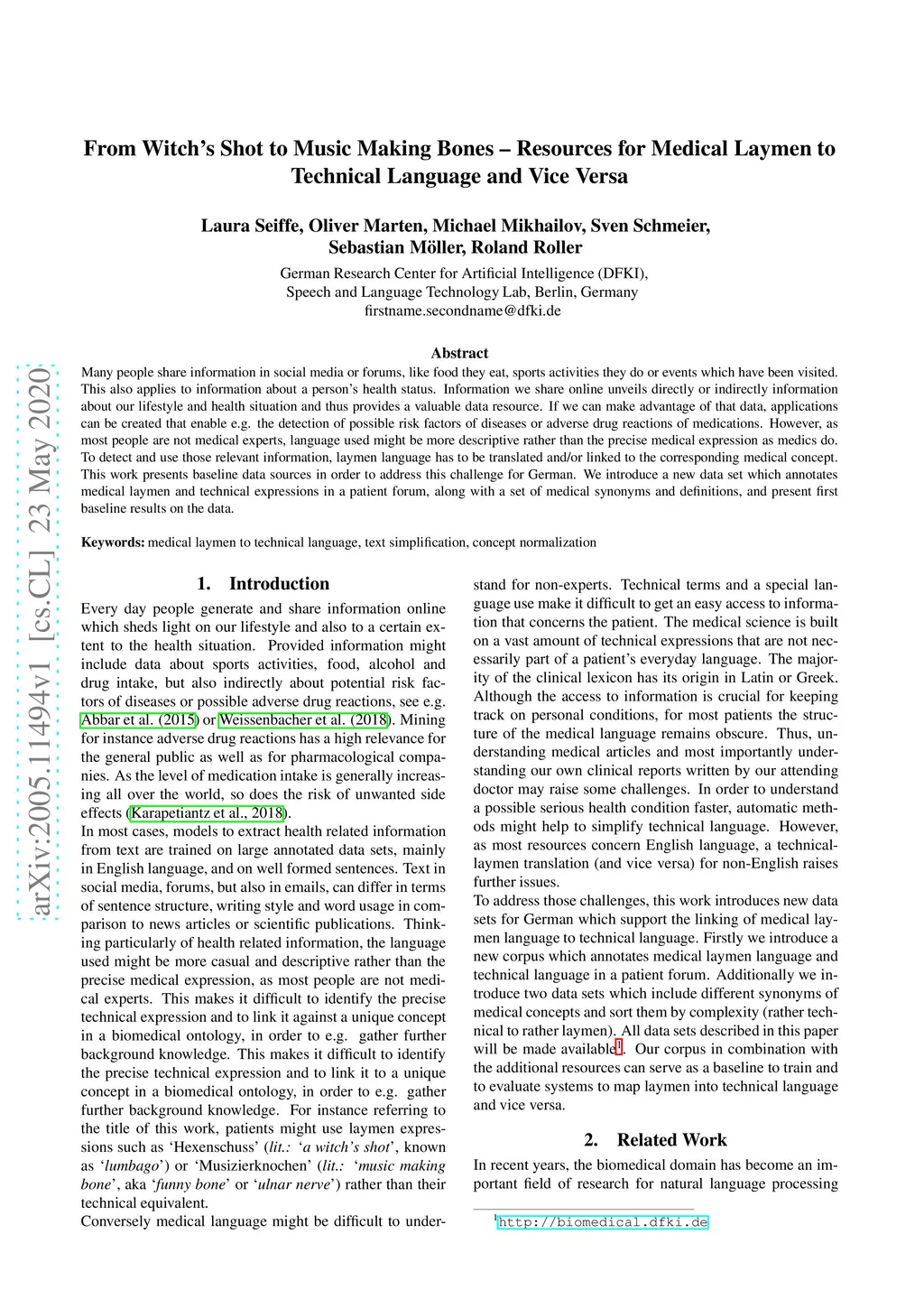 Many people share information in social media or forums, like food they eat, sports activities they do or events which have been visited. This also applies to information about a person's health status. Information we share online unveils directly or indirectly information about our lifestyle and health situation and thus provides a valuable data resource. If we can make advantage of that data, applications can be created that enable e.g. the detection of possible risk factors of diseases or adverse drug reactions of medications. However, as most people are not medical experts, language used might be more descriptive rather than the precise medical expression as medics do. To detect and use those relevant information, laymen language has to be translated and/or linked to the corresponding medical concept. This work presents baseline data sources in order to address this challenge for German. We introduce a new data set which annotates medical laymen and technical expressions in a patient forum, along with a set of medical synonyms and definitions, and present first baseline results on the data.