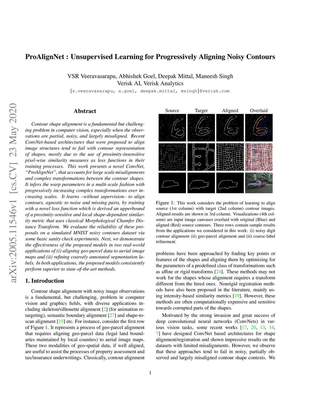Contour shape alignment is a fundamental but challenging problem in computer vision, especially when the observations are partial, noisy, and largely misaligned. Recent ConvNet-based architectures that were proposed to align image structures tend to fail with contour representation of shapes, mostly due to the use of proximity-insensitive pixel-wise similarity measures as loss functions in their training processes. This work presents a novel ConvNet, "ProAlignNet" that accounts for large scale misalignments and complex transformations between the contour shapes. It infers the warp parameters in a multi-scale fashion with progressively increasing complex transformations over increasing scales. It learns --without supervision-- to align contours, agnostic to noise and missing parts, by training with a novel loss function which is derived an upperbound of a proximity-sensitive and local shape-dependent similarity metric that uses classical Morphological Chamfer Distance Transform. We evaluate the reliability of these proposals on a simulated MNIST noisy contours dataset via some basic sanity check experiments. Next, we demonstrate the effectiveness of the proposed models in two real-world applications of (i) aligning geo-parcel data to aerial image maps and (ii) refining coarsely annotated segmentation labels. In both applications, the proposed models consistently perform superior to state-of-the-art methods.