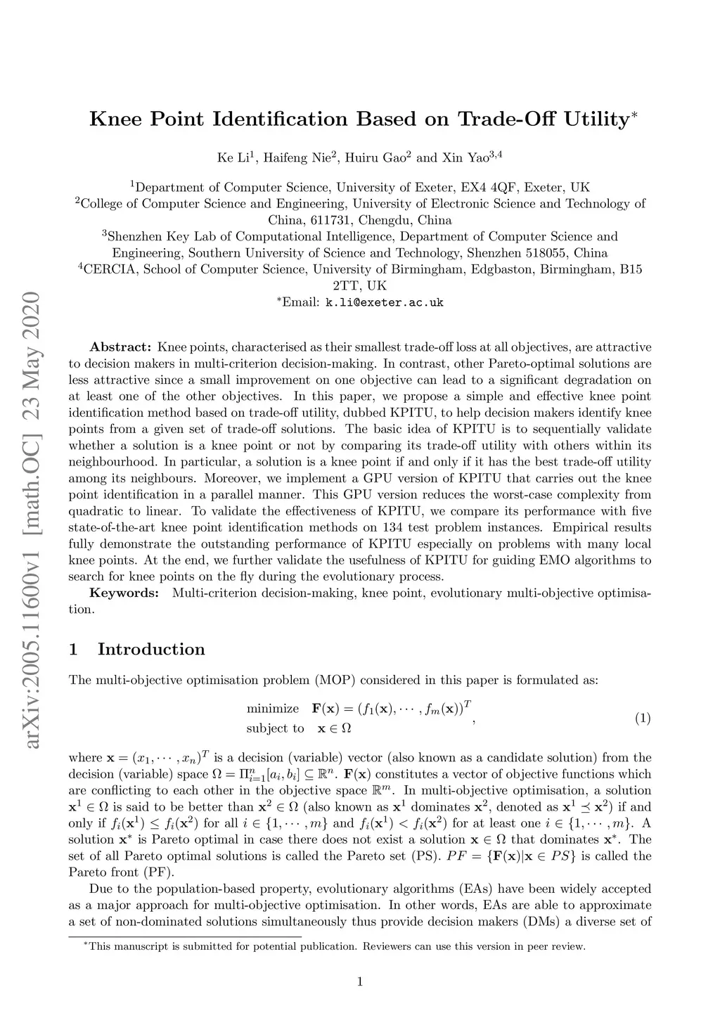 Knee points, characterised as their smallest trade-off loss at all objectives, are attractive to decision makers in multi-criterion decision-making. In contrast, other Pareto-optimal solutions are less attractive since a small improvement on one objective can lead to a significant degradation on at least one of the other objectives. In this paper, we propose a simple and effective knee point identification method based on trade-off utility, dubbed KPITU, to help decision makers identify knee points from a given set of trade-off solutions. The basic idea of KPITU is to sequentially validate whether a solution is a knee point or not by comparing its trade-off utility with others within its neighbourhood. In particular, a solution is a knee point if and only if it has the best trade-off utility among its neighbours. Moreover, we implement a GPU version of KPITU that carries out the knee point identification in a parallel manner. This GPU version reduces the worst-case complexity from quadratic to linear. To validate the effectiveness of KPITU, we compare its performance with five state-of-the-art knee point identification methods on 134 test problem instances. Empirical results fully demonstrate the outstanding performance of KPITU especially on problems with many local knee points. At the end, we further validate the usefulness of KPITU for guiding EMO algorithms to search for knee points on the fly during the evolutionary process.
