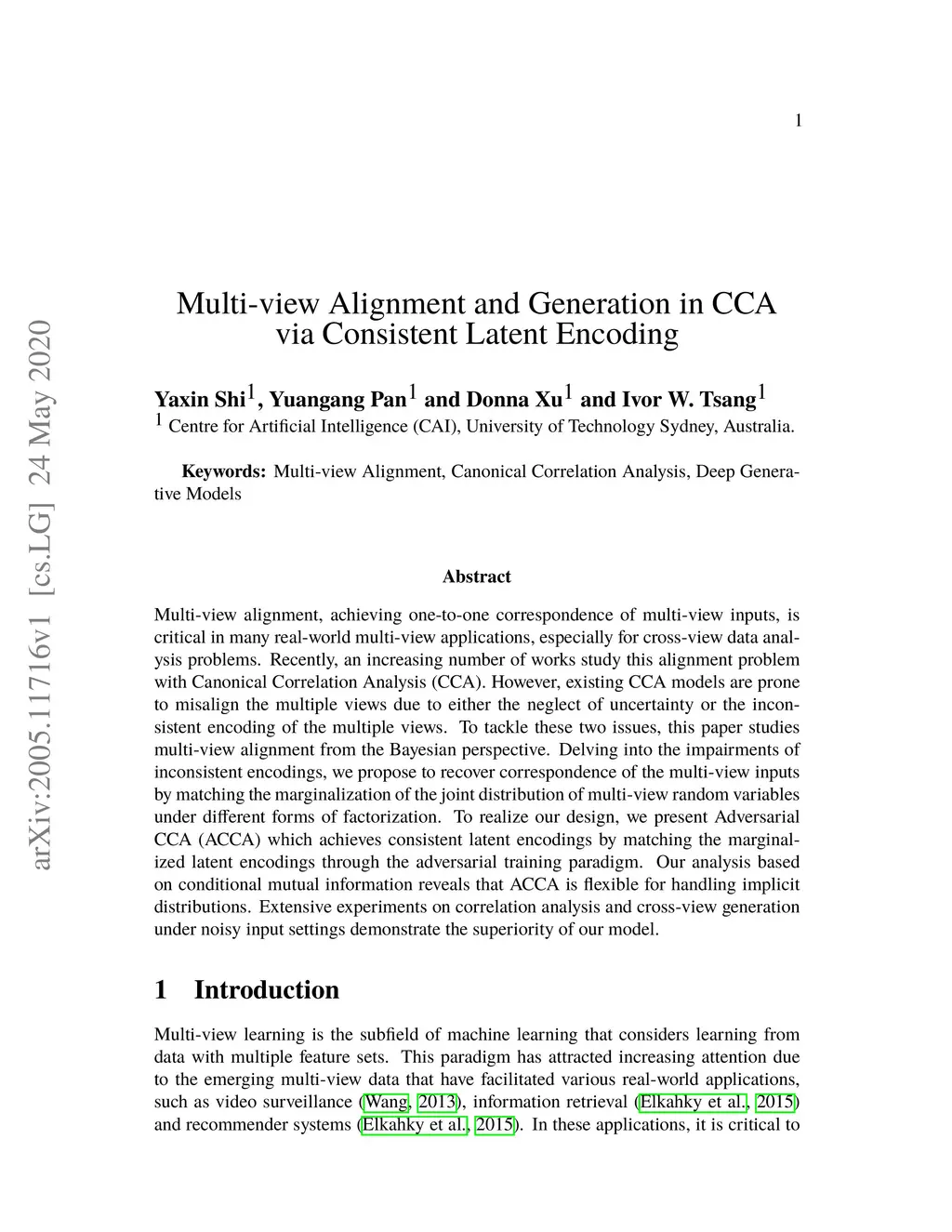 Multi-view alignment, achieving one-to-one correspondence of multi-view inputs, is critical in many real-world multi-view applications, especially for cross-view data analysis problems. Recently, an increasing number of works study this alignment problem with Canonical Correlation Analysis (CCA). However, existing CCA models are prone to misalign the multiple views due to either the neglect of uncertainty or the inconsistent encoding of the multiple views. To tackle these two issues, this paper studies multi-view alignment from the Bayesian perspective. Delving into the impairments of inconsistent encodings, we propose to recover correspondence of the multi-view inputs by matching the marginalization of the joint distribution of multi-view random variables under different forms of factorization. To realize our design, we present Adversarial CCA (ACCA) which achieves consistent latent encodings by matching the marginalized latent encodings through the adversarial training paradigm. Our analysis based on conditional mutual information reveals that ACCA is flexible for handling implicit distributions. Extensive experiments on correlation analysis and cross-view generation under noisy input settings demonstrate the superiority of our model.