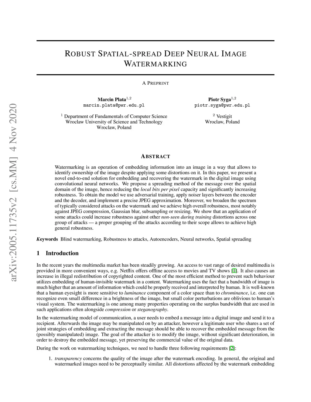 Watermarking is an operation of embedding an information into an image in a way that allows to identify ownership of the image despite applying some distortions on it. In this paper, we presented a novel end-to-end solution for embedding and recovering the watermark in the digital image using convolutional neural networks. The method is based on spreading the message over the spatial domain of the image, hence reducing the "local bits per pixel" capacity. To obtain the model we used adversarial training and applied noiser layers between the encoder and the decoder. Moreover, we broadened the spectrum of typically considered attacks on the watermark and by grouping the attacks according to their scope, we achieved high general robustness, most notably against JPEG compression, Gaussian blurring, subsampling or resizing. To help us in the models training we also proposed a precise differentiable approximation of JPEG.