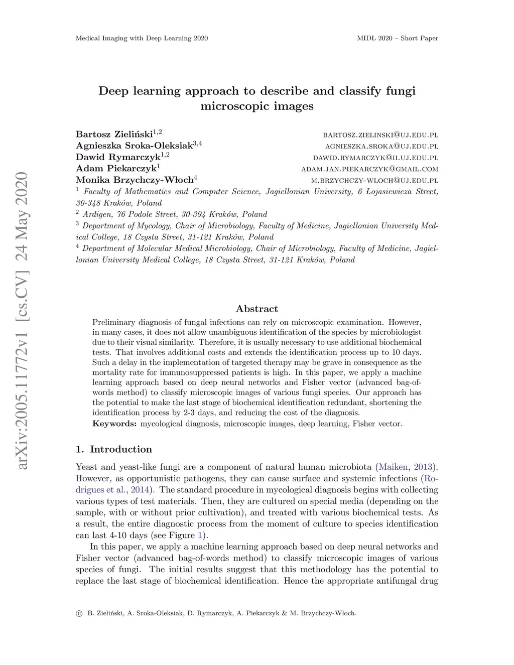 Preliminary diagnosis of fungal infections can rely on microscopic examination. However, in many cases, it does not allow unambiguous identification of the species by microbiologist due to their visual similarity. Therefore, it is usually necessary to use additional biochemical tests. That involves additional costs and extends the identification process up to 10 days. Such a delay in the implementation of targeted therapy may be grave in consequence as the mortality rate for immunosuppressed patients is high. In this paper, we apply a machine learning approach based on deep neural networks and Fisher Vector (advanced bag-of-words method) to classify microscopic images of various fungi species. Our approach has the potential to make the last stage of biochemical identification redundant, shortening the identification process by 2-3 days, and reducing the cost of the diagnosis.