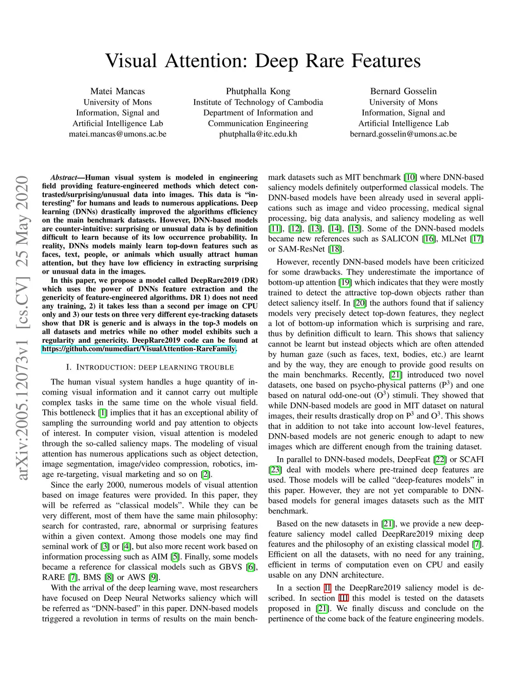 Human visual system is modeled in engineering field providing feature-engineered methods which detect contrasted/surprising/unusual data into images. This data is "interesting" for humans and leads to numerous applications. Deep learning (DNNs) drastically improved the algorithms efficiency on the main benchmark datasets. However, DNN-based models are counter-intuitive: surprising or unusual data is by definition difficult to learn because of its low occurrence probability. In reality, DNNs models mainly learn top-down features such as faces, text, people, or animals which usually attract human attention, but they have low efficiency in extracting surprising or unusual data in the images. In this paper, we propose a model called DeepRare2019 (DR) which uses the power of DNNs feature extraction and the genericity of feature-engineered algorithms. DR 1) does not need any training, 2) it takes less than a second per image on CPU only and 3) our tests on three very different eye-tracking datasets show that DR is generic and is always in the top-3 models on all datasets and metrics while no other model exhibits such a regularity and genericity. DeepRare2019 code can be found at https://github.com/numediart/VisualAttention-RareFamily