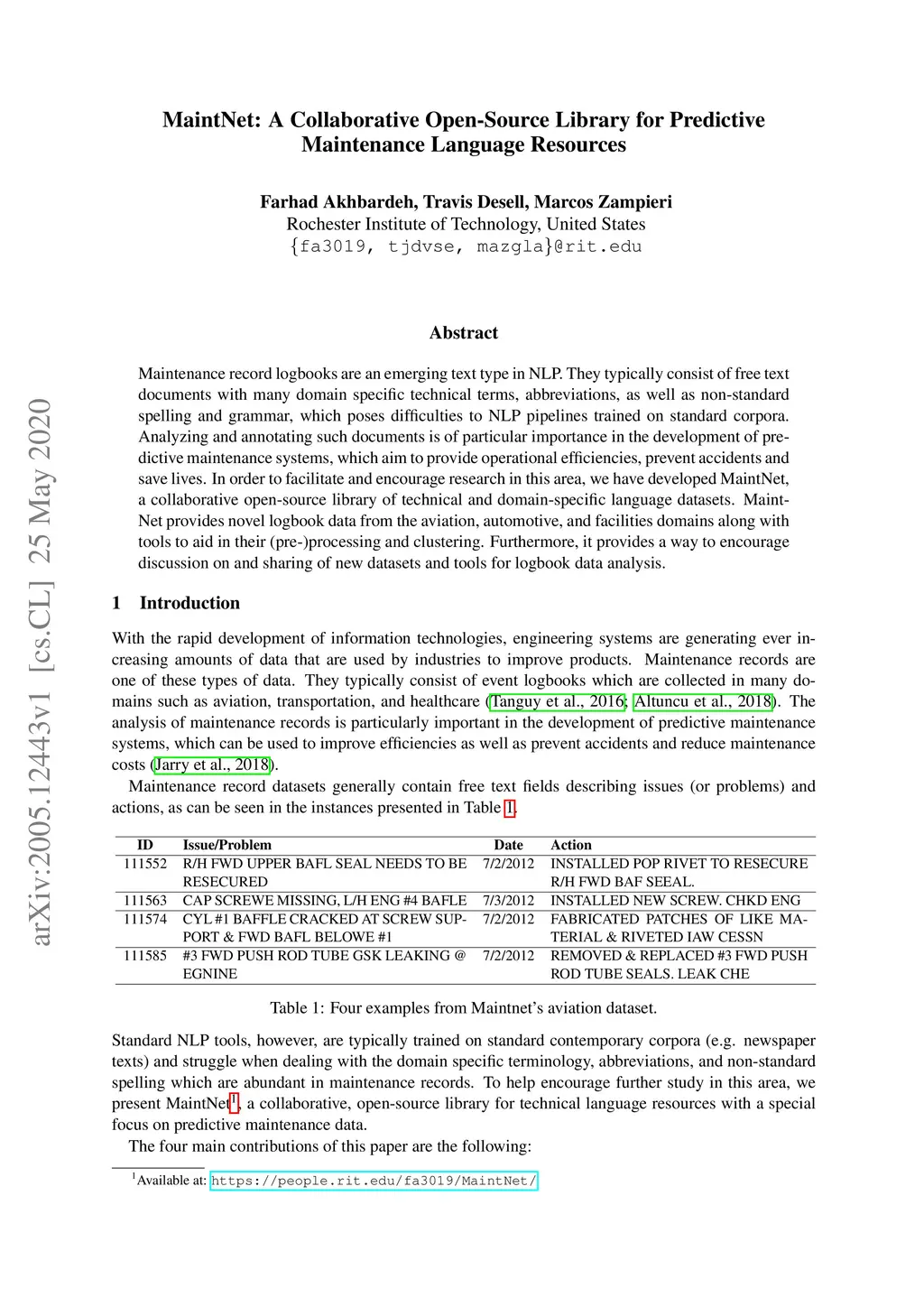 Maintenance record logbooks are an emerging text type in NLP. They typically consist of free text documents with many domain specific technical terms, abbreviations, as well as non-standard spelling and grammar, which poses difficulties to NLP pipelines trained on standard corpora. Analyzing and annotating such documents is of particular importance in the development of predictive maintenance systems, which aim to provide operational efficiencies, prevent accidents and save lives. In order to facilitate and encourage research in this area, we have developed MaintNet, a collaborative open-source library of technical and domain-specific language datasets. MaintNet provides novel logbook data from the aviation, automotive, and facilities domains along with tools to aid in their (pre-)processing and clustering. Furthermore, it provides a way to encourage discussion on and sharing of new datasets and tools for logbook data analysis.