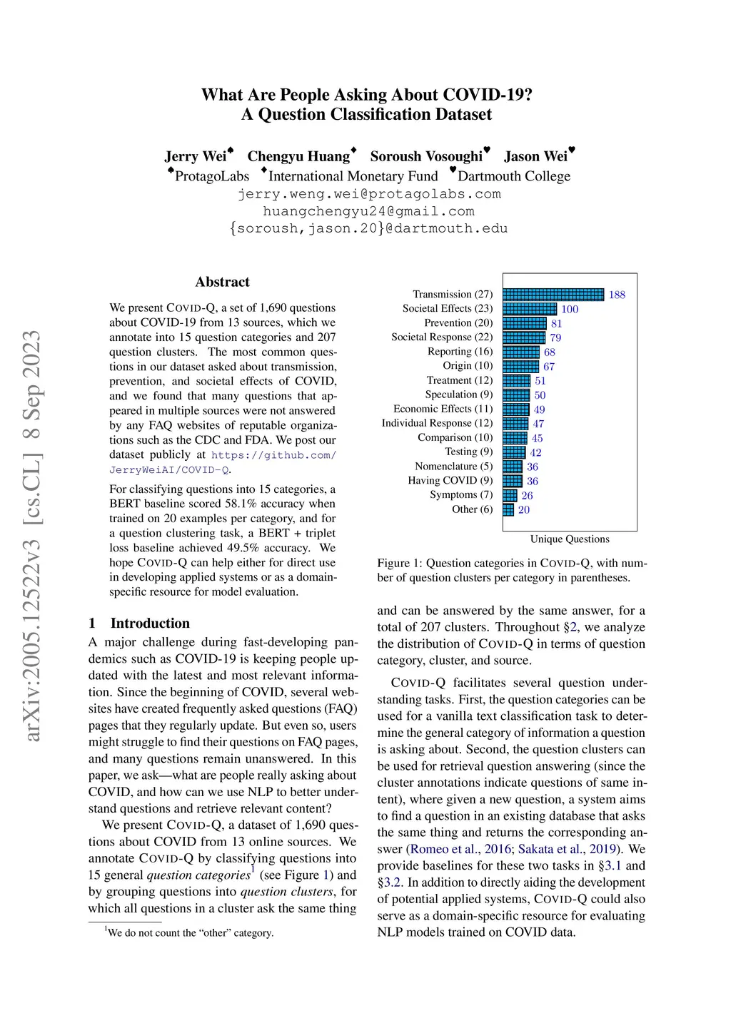 We present COVID-Q, a set of 1,690 questions about COVID-19 from 13 sources, which we annotate into 15 question categories and 207 question clusters. The most common questions in our dataset asked about transmission, prevention, and societal effects of COVID, and we found that many questions that appeared in multiple sources were not answered by any FAQ websites of reputable organizations such as the CDC and FDA. We post our dataset publicly at https://github.com/JerryWeiAI/COVID-Q. For classifying questions into 15 categories, a BERT baseline scored 58.1% accuracy when trained on 20 examples per category, and for a question clustering task, a BERT + triplet loss baseline achieved 49.5% accuracy. We hope COVID-Q can help either for direct use in developing applied systems or as a domain-specific resource for model evaluation.