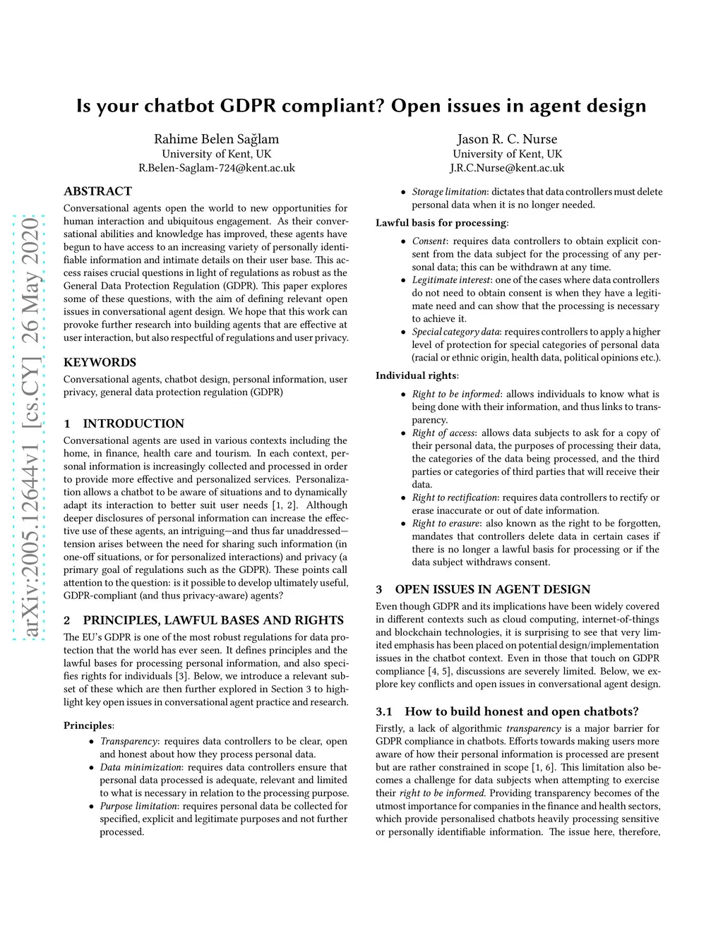 Is your chatbot GDPR compliant? Open issues in agent design