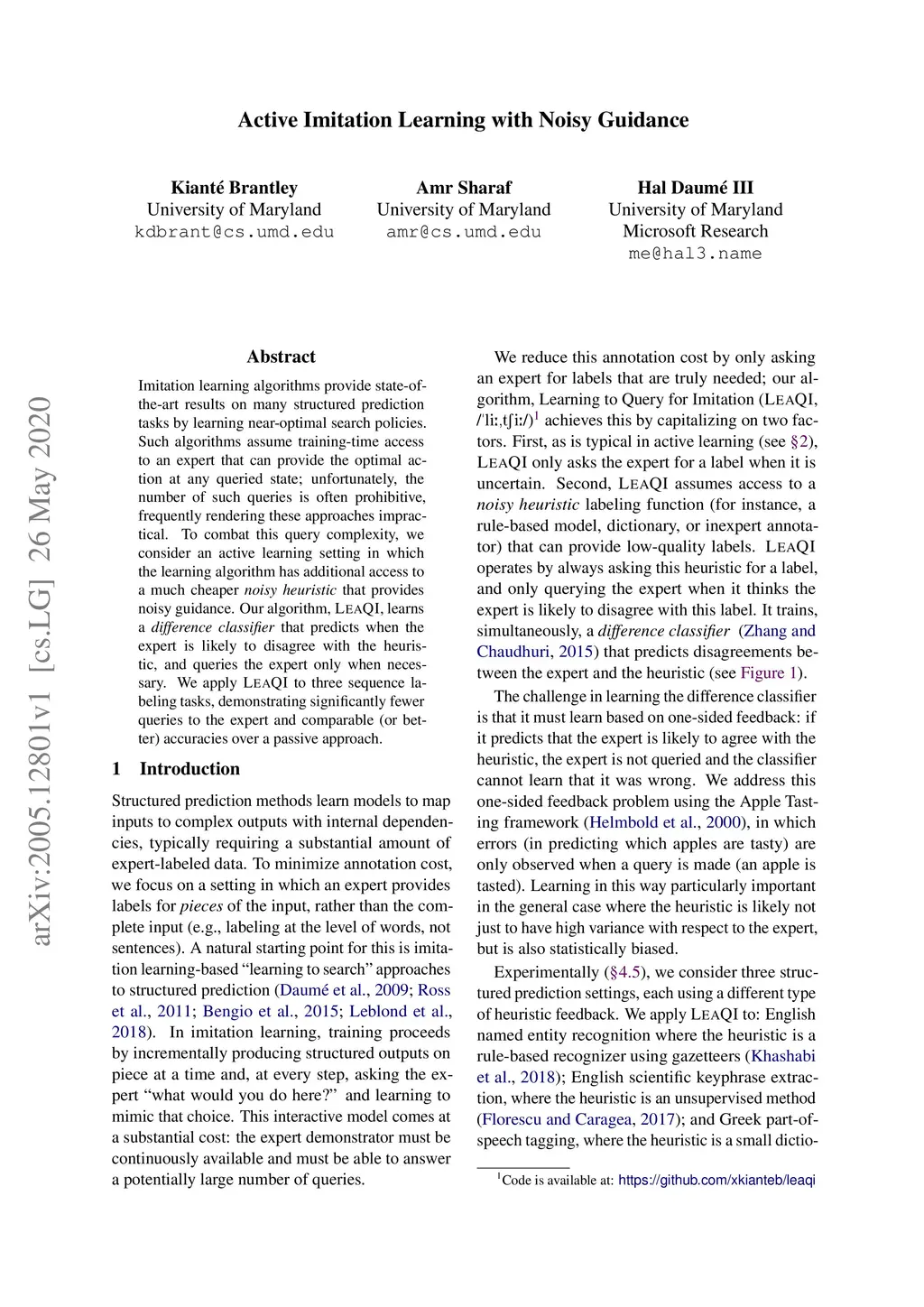 Imitation learning algorithms provide state-of-the-art results on many structured prediction tasks by learning near-optimal search policies. Such algorithms assume training-time access to an expert that can provide the optimal action at any queried state; unfortunately, the number of such queries is often prohibitive, frequently rendering these approaches impractical. To combat this query complexity, we consider an active learning setting in which the learning algorithm has additional access to a much cheaper noisy heuristic that provides noisy guidance. Our algorithm, LEAQI, learns a difference classifier that predicts when the expert is likely to disagree with the heuristic, and queries the expert only when necessary. We apply LEAQI to three sequence labeling tasks, demonstrating significantly fewer queries to the expert and comparable (or better) accuracies over a passive approach.