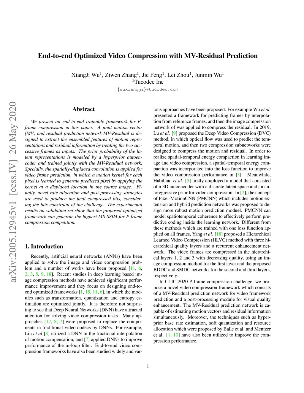 We present an end-to-end trainable framework for P-frame compression in this paper. A joint motion vector (MV) and residual prediction network MV-Residual is designed to extract the ensembled features of motion representations and residual information by treating the two successive frames as inputs. The prior probability of the latent representations is modeled by a hyperprior autoencoder and trained jointly with the MV-Residual network. Specially, the spatially-displaced convolution is applied for video frame prediction, in which a motion kernel for each pixel is learned to generate predicted pixel by applying the kernel at a displaced location in the source image. Finally, novel rate allocation and post-processing strategies are used to produce the final compressed bits, considering the bits constraint of the challenge. The experimental results on validation set show that the proposed optimized framework can generate the highest MS-SSIM for P-frame compression competition.