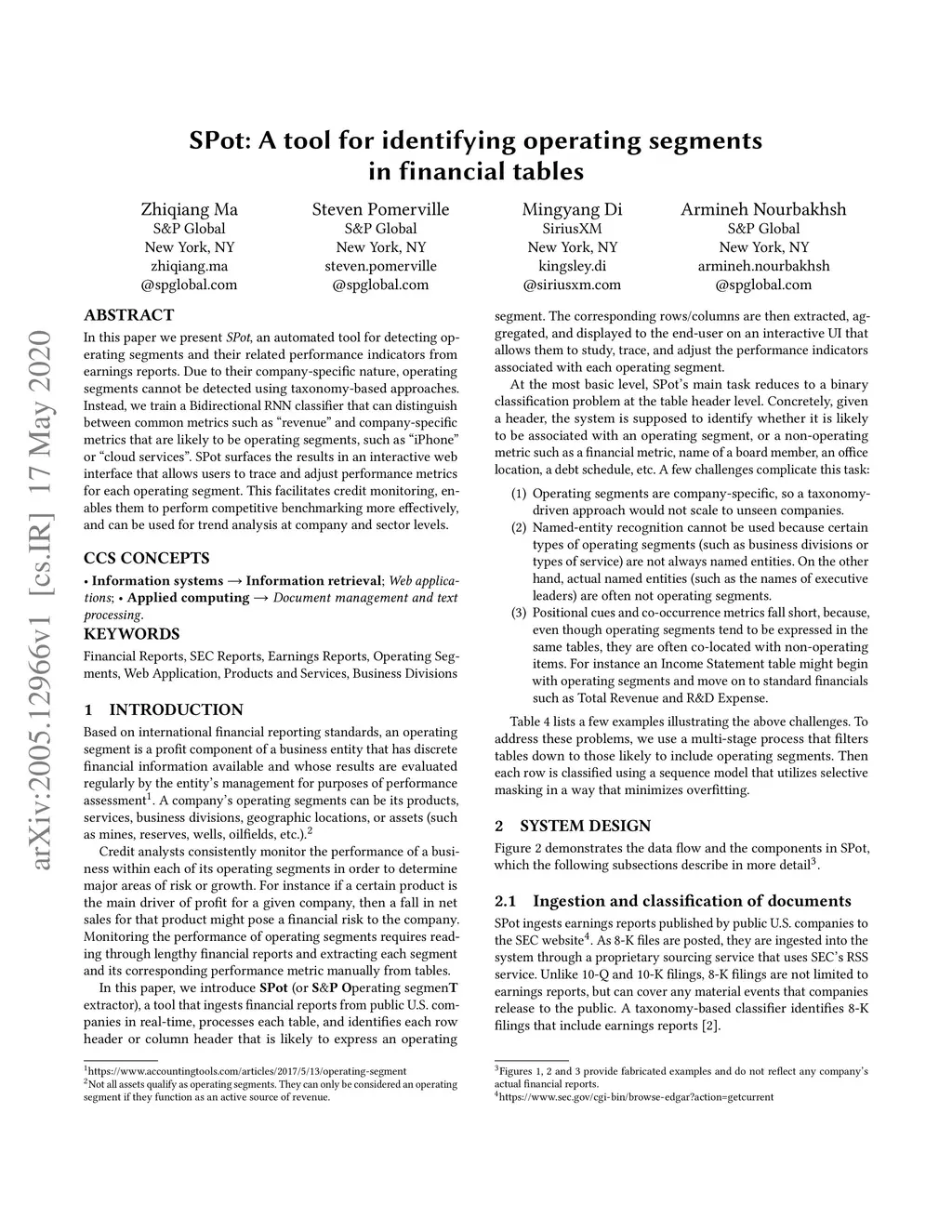 In this paper we present SPot, an automated tool for detecting operating segments and their related performance indicators from earnings reports. Due to their company-specific nature, operating segments cannot be detected using taxonomy-based approaches. Instead, we train a Bidirectional RNN classifier that can distinguish between common metrics such as "revenue" and company-specific metrics that are likely to be operating segments, such as "iPhone" or "cloud services". SPot surfaces the results in an interactive web interface that allows users to trace and adjust performance metrics for each operating segment. This facilitates credit monitoring, enables them to perform competitive benchmarking more effectively, and can be used for trend analysis at company and sector levels.
