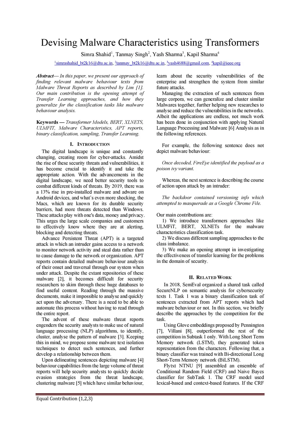 With the increasing number of cybersecurity threats, it becomes more difficult for researchers to skim through the security reports for malware analysis. There is a need to be able to extract highly relevant sentences without having to read through the entire malware reports. In this paper, we are finding relevant malware behavior mentions from Advanced Persistent Threat Reports. This main contribution is an opening attempt to Transformer the approach for malware behavior analysis.