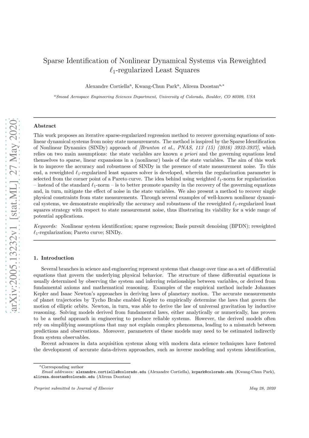 This work proposes an iterative sparse-regularized regression method to recover governing equations of nonlinear dynamical systems from noisy state measurements. The method is inspired by the Sparse Identification of Nonlinear Dynamics (SINDy) approach of {\it [Brunton et al., PNAS, 113 (15) (2016) 3932-3937]}, which relies on two main assumptions: the state variables are known {\it a priori} and the governing equations lend themselves to sparse, linear expansions in a (nonlinear) basis of the state variables. The aim of this work is to improve the accuracy and robustness of SINDy in the presence of state measurement noise. To this end, a reweighted -regularized least squares solver is developed, wherein the regularization parameter is selected from the corner point of a Pareto curve. The idea behind using weighted -norm for regularization -- instead of the standard -norm -- is to better promote sparsity in the recovery of the governing equations and, in turn, mitigate the effect of noise in the state variables. We also present a method to recover single physical constraints from state measurements. Through several examples of well-known nonlinear dynamical systems, we demonstrate empirically the accuracy and robustness of the reweighted -regularized least squares strategy with respect to state measurement noise, thus illustrating its viability for a wide range of potential applications.