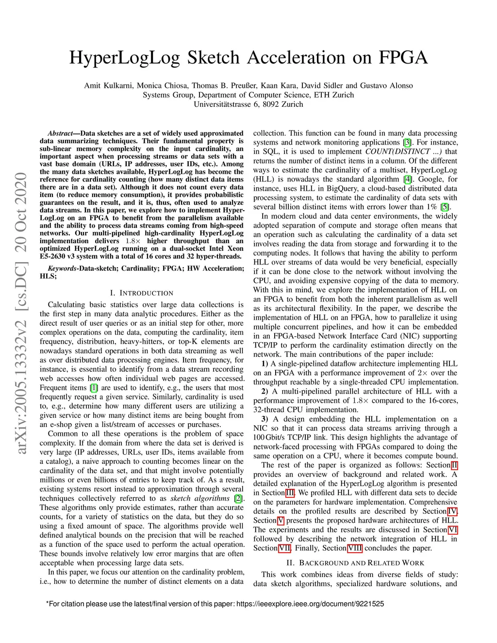 Data sketches are a set of widely used approximated data summarizing techniques. Their fundamental property is sub-linear memory complexity on the input cardinality, an important aspect when processing streams or data sets with a vast base domain (URLs, IP addresses, user IDs, etc.). Among the many data sketches available, HyperLogLog has become the reference for cardinality counting (how many distinct data items there are in a data set). Although it does not count every data item (to reduce memory consumption), it provides probabilistic guarantees on the result, and it is, thus, often used to analyze data streams. In this paper, we explore how to implement HyperLogLog on an FPGA to benefit from the parallelism available and the ability to process data streams coming from high-speed networks. Our multi-pipelined high-cardinality HyperLogLog implementation delivers 1.8x higher throughput than an optimized HyperLogLog running on a dual-socket Intel Xeon E5-2630 v3 system with a total of 16 cores and 32 hyper-threads.