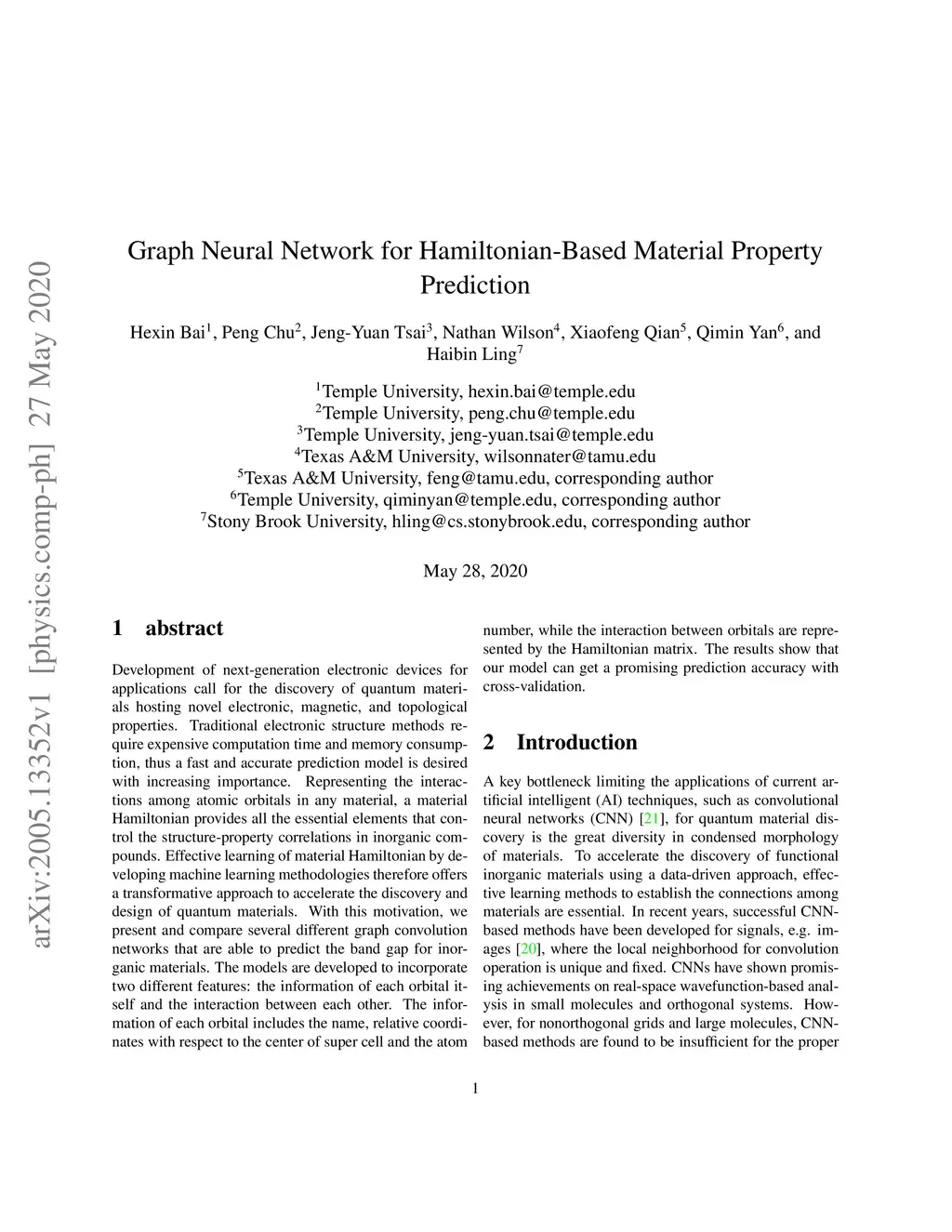 Development of next-generation electronic devices for applications call for the discovery of quantum materials hosting novel electronic, magnetic, and topological properties. Traditional electronic structure methods require expensive computation time and memory consumption, thus a fast and accurate prediction model is desired with increasing importance. Representing the interactions among atomic orbitals in any material, a material Hamiltonian provides all the essential elements that control the structure-property correlations in inorganic compounds. Effective learning of material Hamiltonian by developing machine learning methodologies therefore offers a transformative approach to accelerate the discovery and design of quantum materials. With this motivation, we present and compare several different graph convolution networks that are able to predict the band gap for inorganic materials. The models are developed to incorporate two different features: the information of each orbital itself and the interaction between each other. The information of each orbital includes the name, relative coordinates with respect to the center of super cell and the atom number, while the interaction between orbitals are represented by the Hamiltonian matrix. The results show that our model can get a promising prediction accuracy with cross-validation.