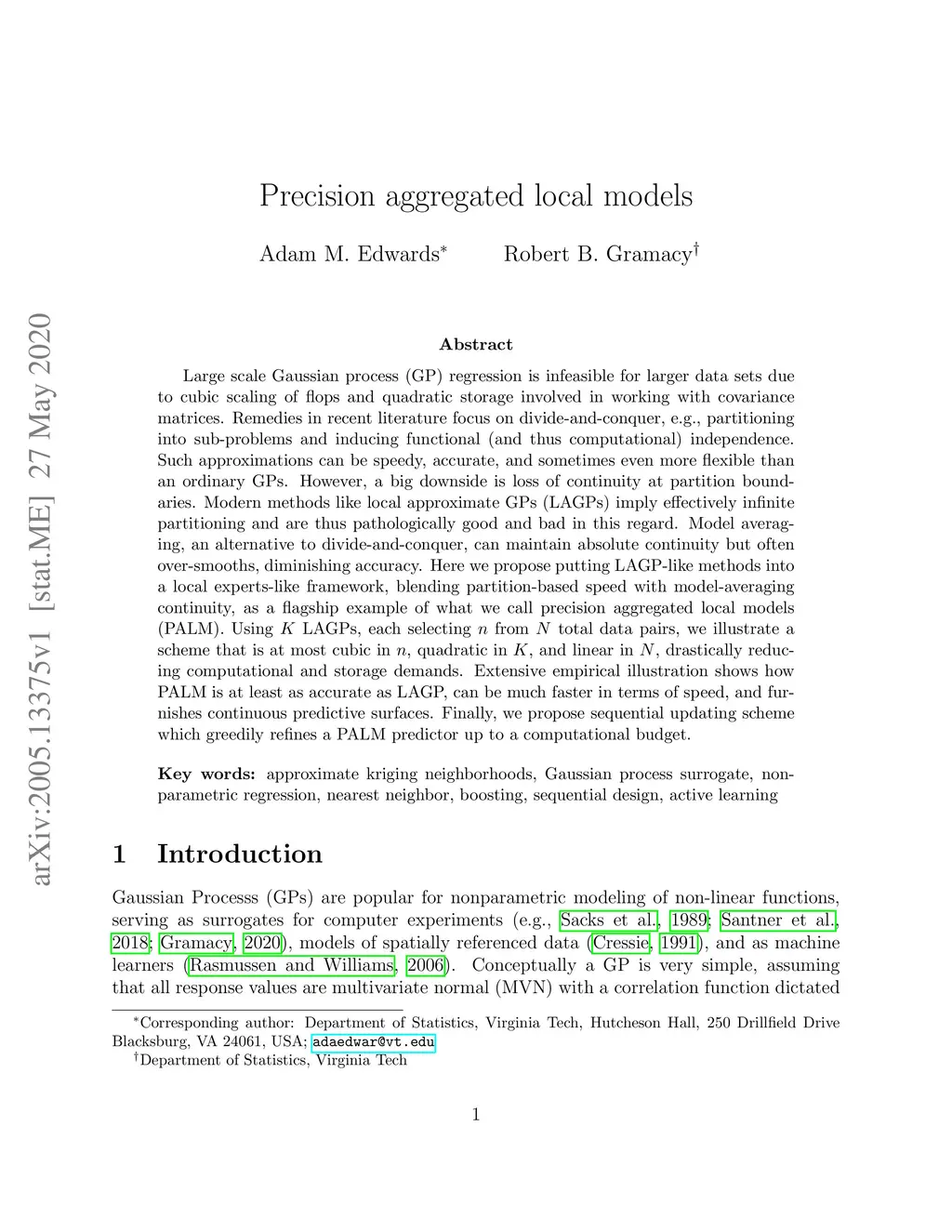 Large scale Gaussian process (GP) regression is infeasible for larger data sets due to cubic scaling of flops and quadratic storage involved in working with covariance matrices. Remedies in recent literature focus on divide-and-conquer, e.g., partitioning into sub-problems and inducing functional (and thus computational) independence. Such approximations can be speedy, accurate, and sometimes even more flexible than an ordinary GPs. However, a big downside is loss of continuity at partition boundaries. Modern methods like local approximate GPs (LAGPs) imply effectively infinite partitioning and are thus pathologically good and bad in this regard. Model averaging, an alternative to divide-and-conquer, can maintain absolute continuity but often over-smooths, diminishing accuracy. Here we propose putting LAGP-like methods into a local experts-like framework, blending partition-based speed with model-averaging continuity, as a flagship example of what we call precision aggregated local models (PALM). Using LAGPs, each selecting from total data pairs, we illustrate a scheme that is at most cubic in , quadratic in , and linear in , drastically reducing computational and storage demands. Extensive empirical illustration shows how PALM is at least as accurate as LAGP, can be much faster in terms of speed, and furnishes continuous predictive surfaces. Finally, we propose sequential updating scheme which greedily refines a PALM predictor up to a computational budget.