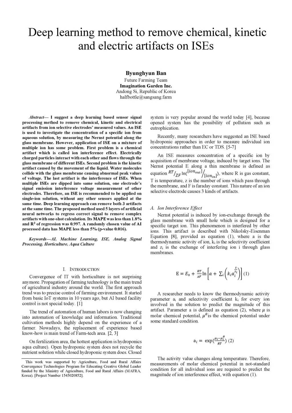We suggest a deep learning based sensor signal processing method to remove chemical, kinetic and electrical artifacts from ion selective electrodes' measured values. An ISE is used to investigate the concentration of a specific ion from aqueous solution, by measuring the Nernst potential along the glass membrane. However, application of ISE on a mixture of multiple ion has some problem. First problem is a chemical artifact which is called ion interference effect. Electrically charged particles interact with each other and flows through the glass membrane of different ISEs. Second problem is the kinetic artifact caused by the movement of the liquid. Water molecules collide with the glass membrane causing abnormal peak values of voltage. The last artifact is the interference of ISEs. When multiple ISEs are dipped into same solution, one electrode's signal emission interference voltage measurement of other electrodes. Therefore, an ISE is recommended to be applied on single-ion solution, without any other sensors applied at the same time. Deep learning approach can remove both 3 artifacts at the same time. The proposed method used 5 layers of artificial neural networks to regress correct signal to remove complex artifacts with one-shot calculation. Its MAPE was less than 1.8% and R2 of regression was 0.997. A randomly chosen value of AI-processed data has MAPE less than 5% (p-value 0.016).