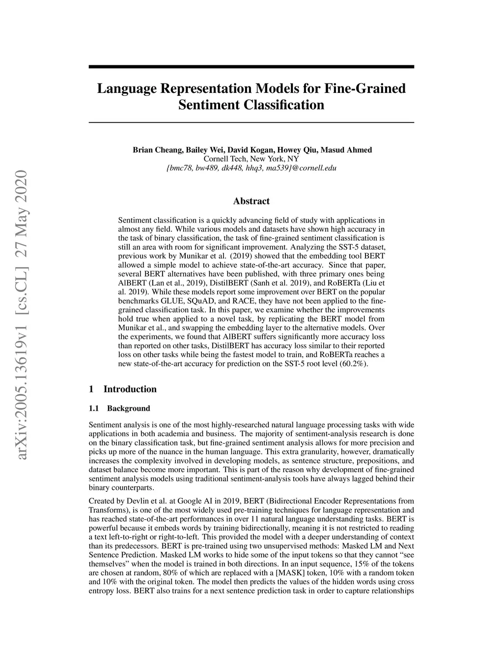 Sentiment classification is a quickly advancing field of study with applications in almost any field. While various models and datasets have shown high accuracy inthe task of binary classification, the task of fine-grained sentiment classification is still an area with room for significant improvement. Analyzing the SST-5 dataset,previous work by Munikar et al. (2019) showed that the embedding tool BERT allowed a simple model to achieve state-of-the-art accuracy. Since that paper, several BERT alternatives have been published, with three primary ones being AlBERT (Lan et al., 2019), DistilBERT (Sanh et al. 2019), and RoBERTa (Liu etal. 2019). While these models report some improvement over BERT on the popular benchmarks GLUE, SQuAD, and RACE, they have not been applied to the fine-grained classification task. In this paper, we examine whether the improvements hold true when applied to a novel task, by replicating the BERT model from Munikar et al., and swapping the embedding layer to the alternative models. Over the experiments, we found that AlBERT suffers significantly more accuracy loss than reported on other tasks, DistilBERT has accuracy loss similar to their reported loss on other tasks while being the fastest model to train, and RoBERTa reaches anew state-of-the-art accuracy for prediction on the SST-5 root level (60.2%).