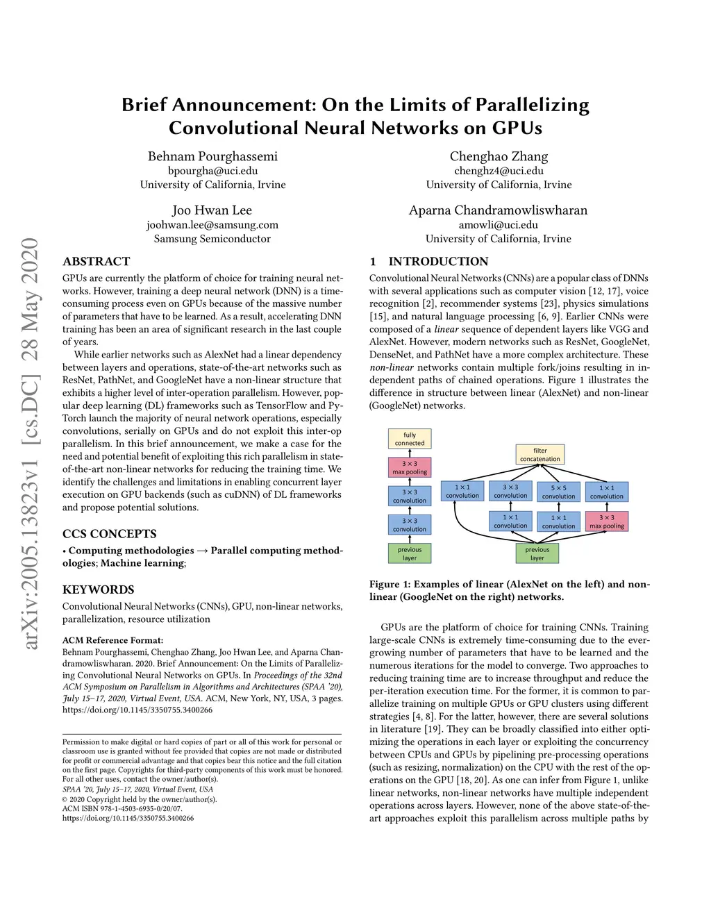 GPUs are currently the platform of choice for training neural networks. However, training a deep neural network (DNN) is a time-consuming process even on GPUs because of the massive number of parameters that have to be learned. As a result, accelerating DNN training has been an area of significant research in the last couple of years. While earlier networks such as AlexNet had a linear dependency between layers and operations, state-of-the-art networks such as ResNet, PathNet, and GoogleNet have a non-linear structure that exhibits a higher level of inter-operation parallelism. However, popular deep learning (DL) frameworks such as TensorFlow and PyTorch launch the majority of neural network operations, especially convolutions, serially on GPUs and do not exploit this inter-op parallelism. In this brief announcement, we make a case for the need and potential benefit of exploiting this rich parallelism in state-of-the-art non-linear networks for reducing the training time. We identify the challenges and limitations in enabling concurrent layer execution on GPU backends (such as cuDNN) of DL frameworks and propose potential solutions.