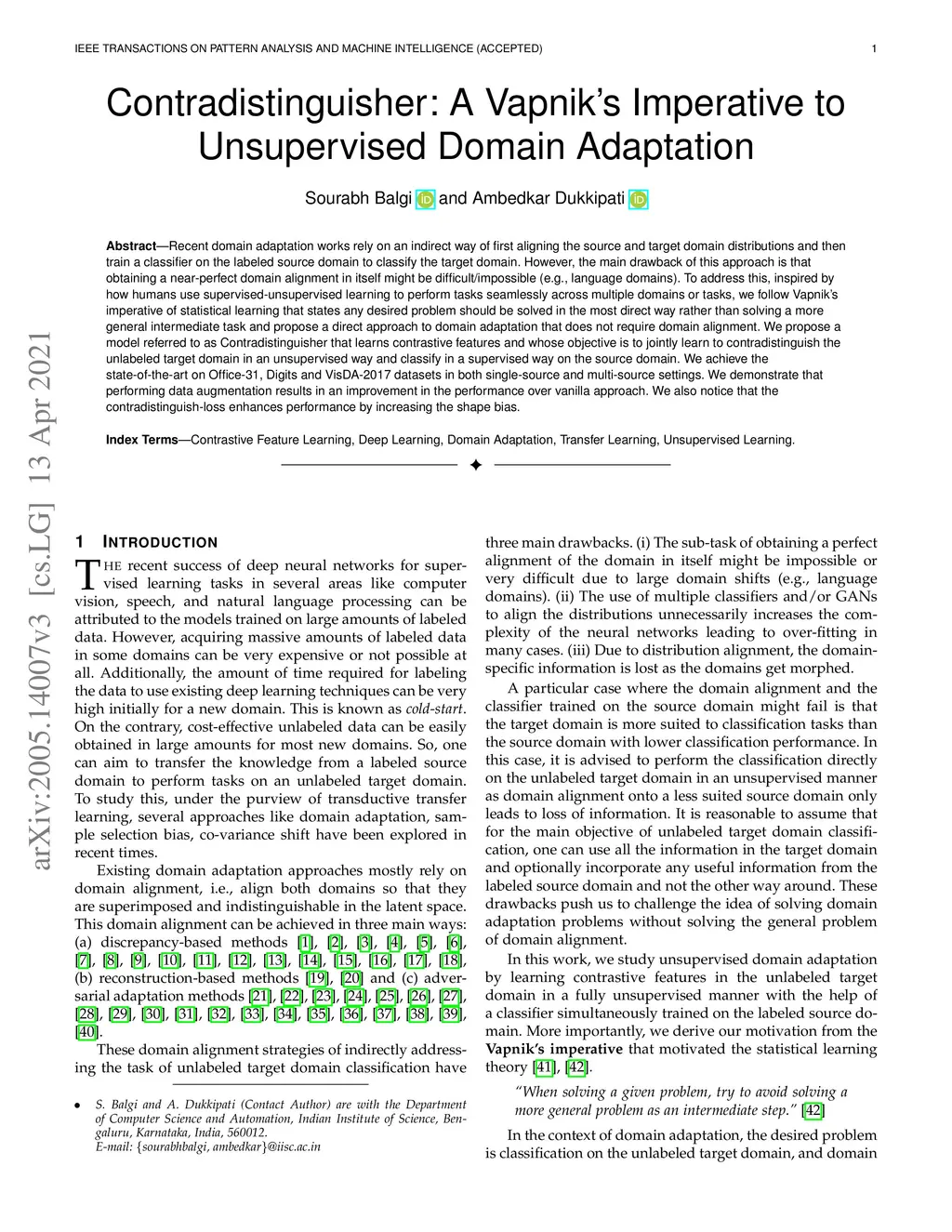 A complex combination of simultaneous supervised-unsupervised learning is believed to be the key to humans performing tasks seamlessly across multiple domains or tasks. This phenomenon of cross-domain learning has been very well studied in domain adaptation literature. Recent domain adaptation works rely on an indirect way of first aligning the source and target domain distributions and then train a classifier on the labeled source domain to classify the target domain. However, this approach has the main drawback that obtaining a near-perfect alignment of the domains in itself might be difficult/impossible (e.g., language domains). To address this, we follow Vapnik's imperative of statistical learning that states any desired problem should be solved in the most direct way rather than solving a more general intermediate task and propose a direct approach to domain adaptation that does not require domain alignment. We propose a model referred Contradistinguisher that learns contrastive features and whose objective is to jointly learn to contradistinguish the unlabeled target domain in an unsupervised way and classify in a supervised way on the source domain. We achieve the state-of-the-art on Office-31 and VisDA-2017 datasets in both single-source and multi-source settings. We also notice that the contradistinguish loss improves the model performance by increasing the shape bias.