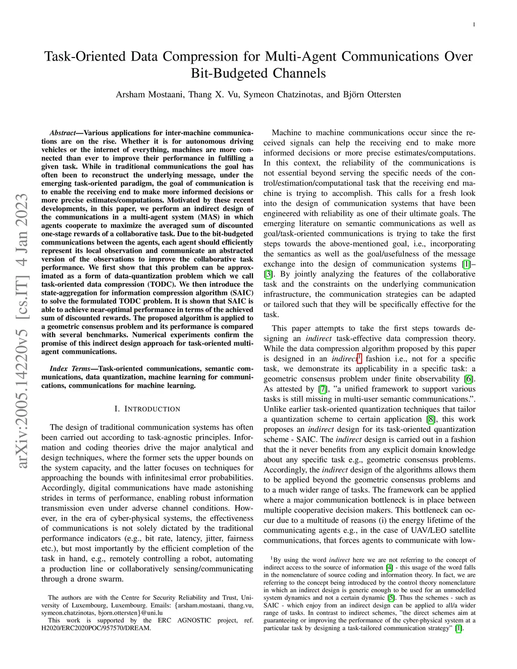 Various applications for inter-machine communications are on the rise. Whether it is for autonomous driving vehicles or the internet of everything, machines are more connected than ever to improve their performance in fulfilling a given task. While in traditional communications the goal has often been to reconstruct the underlying message, under the emerging task-oriented paradigm, the goal of communication is to enable the receiving end to make more informed decisions or more precise estimates/computations. Motivated by these recent developments, in this paper, we perform an indirect design of the communications in a multi-agent system (MAS) in which agents cooperate to maximize the averaged sum of discounted one-stage rewards of a collaborative task. Due to the bit-budgeted communications between the agents, each agent should efficiently represent its local observation and communicate an abstracted version of the observations to improve the collaborative task performance. We first show that this problem can be approximated as a form of data-quantization problem which we call task-oriented data compression (TODC). We then introduce the state-aggregation for information compression algorithm (SAIC) to solve the formulated TODC problem. It is shown that SAIC is able to achieve near-optimal performance in terms of the achieved sum of discounted rewards. The proposed algorithm is applied to a geometric consensus problem and its performance is compared with several benchmarks. Numerical experiments confirm the promise of this indirect design approach for task-oriented multi-agent communications.