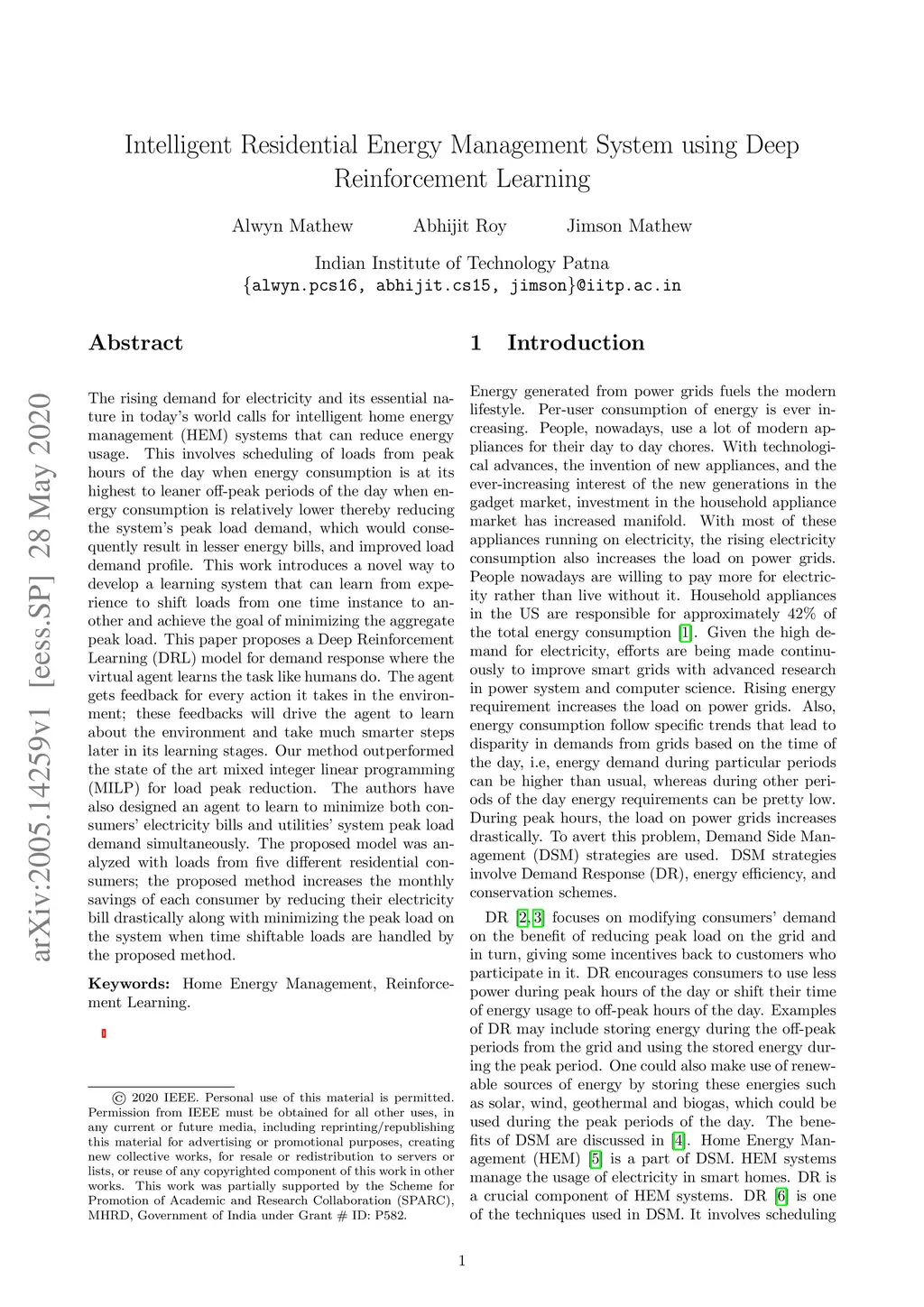 Intelligent Residential Energy Management System using Deep