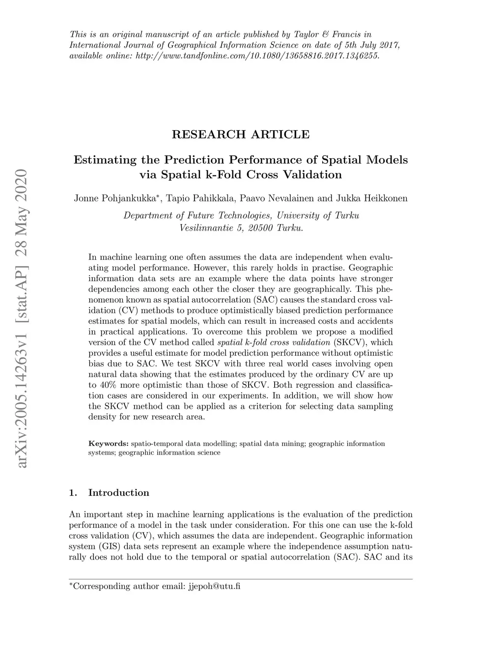 In machine learning one often assumes the data are independent when evaluating model performance. However, this rarely holds in practise. Geographic information data sets are an example where the data points have stronger dependencies among each other the closer they are geographically. This phenomenon known as spatial autocorrelation (SAC) causes the standard cross validation (CV) methods to produce optimistically biased prediction performance estimates for spatial models, which can result in increased costs and accidents in practical applications. To overcome this problem we propose a modified version of the CV method called spatial k-fold cross validation (SKCV), which provides a useful estimate for model prediction performance without optimistic bias due to SAC. We test SKCV with three real world cases involving open natural data showing that the estimates produced by the ordinary CV are up to 40% more optimistic than those of SKCV. Both regression and classification cases are considered in our experiments. In addition, we will show how the SKCV method can be applied as a criterion for selecting data sampling density for new research area.