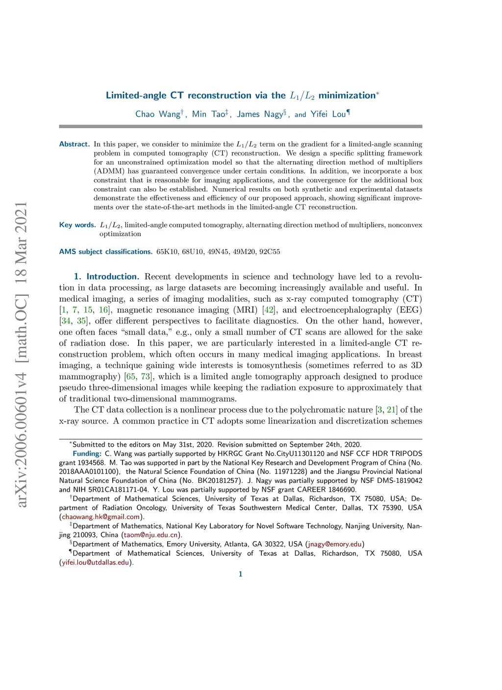 Limited-angle CT reconstruction via the L1/L2 minimization