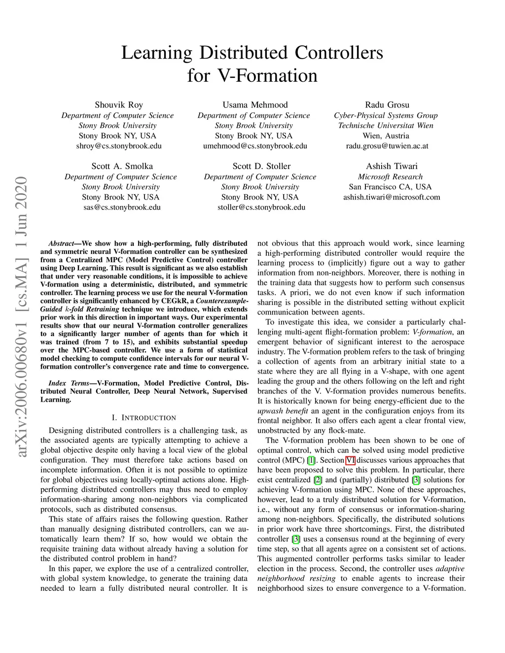 We show how a high-performing, fully distributed and symmetric neural V-formation controller can be synthesized from a Centralized MPC (Model Predictive Control) controller using Deep Learning. This result is significant as we also establish that under very reasonable conditions, it is impossible to achieve V-formation using a deterministic, distributed, and symmetric controller. The learning process we use for the neural V-formation controller is significantly enhanced by CEGkR, a Counterexample-Guided k-fold Retraining technique we introduce, which extends prior work in this direction in important ways. Our experimental results show that our neural V-formation controller generalizes to a significantly larger number of agents than for which it was trained (from 7 to 15), and exhibits substantial speedup over the MPC-based controller. We use a form of statistical model checking to compute confidence intervals for our neural V-formation controller's convergence rate and time to convergence.