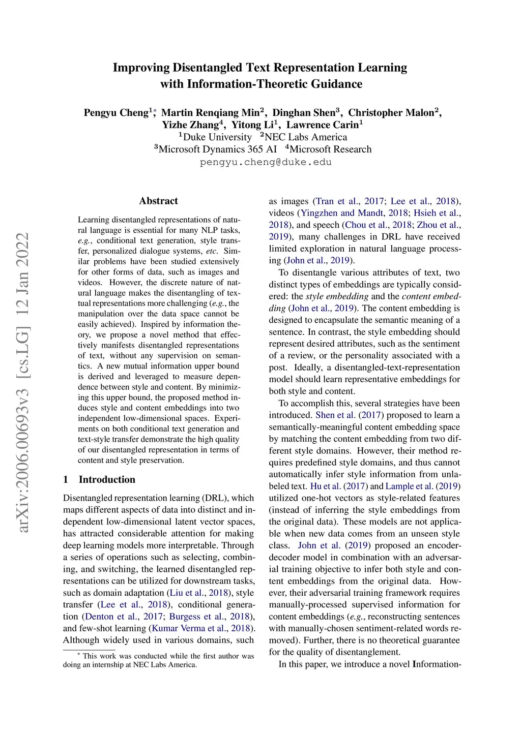 Learning disentangled representations of natural language is essential for many NLP tasks, e.g., conditional text generation, style transfer, personalized dialogue systems, etc. Similar problems have been studied extensively for other forms of data, such as images and videos. However, the discrete nature of natural language makes the disentangling of textual representations more challenging (e.g., the manipulation over the data space cannot be easily achieved). Inspired by information theory, we propose a novel method that effectively manifests disentangled representations of text, without any supervision on semantics. A new mutual information upper bound is derived and leveraged to measure dependence between style and content. By minimizing this upper bound, the proposed method induces style and content embeddings into two independent low-dimensional spaces. Experiments on both conditional text generation and text-style transfer demonstrate the high quality of our disentangled representation in terms of content and style preservation.