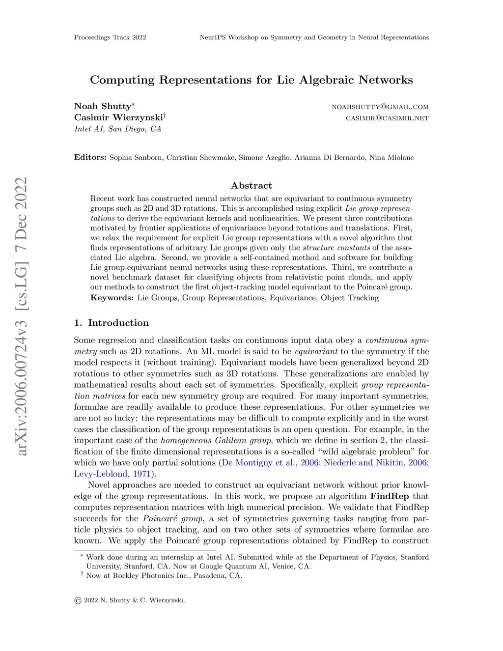 Recent work has constructed neural networks that are equivariant to continuous symmetry groups such as 2D and 3D rotations. This is accomplished using explicit Lie group representations to derive the equivariant kernels and nonlinearities. We present three contributions motivated by frontier applications of equivariance beyond rotations and translations. First, we relax the requirement for explicit Lie group representations with a novel algorithm that finds representations of arbitrary Lie groups given only the structure constants of the associated Lie algebra. Second, we provide a self-contained method and software for building Lie group-equivariant neural networks using these representations. Third, we contribute a novel benchmark dataset for classifying objects from relativistic point clouds, and apply our methods to construct the first object-tracking model equivariant to the Poincar\é group.