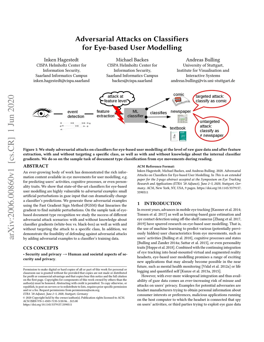 An ever-growing body of work has demonstrated the rich information content available in eye movements for user modelling, e.g. for predicting users' activities, cognitive processes, or even personality traits. We show that state-of-the-art classifiers for eye-based user modelling are highly vulnerable to adversarial examples: small artificial perturbations in gaze input that can dramatically change a classifier's predictions. We generate these adversarial examples using the Fast Gradient Sign Method (FGSM) that linearises the gradient to find suitable perturbations. On the sample task of eye-based document type recognition we study the success of different adversarial attack scenarios: with and without knowledge about classifier gradients (white-box vs. black-box) as well as with and without targeting the attack to a specific class, In addition, we demonstrate the feasibility of defending against adversarial attacks by adding adversarial examples to a classifier's training data.