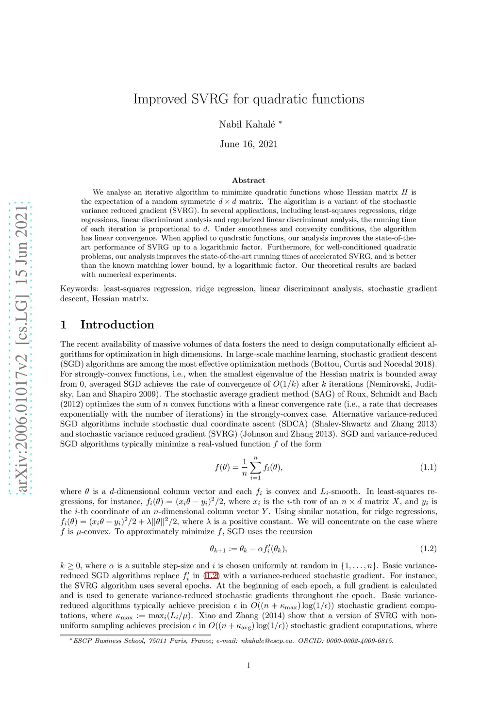 We analyse an iterative algorithm to minimize quadratic functions whose Hessian matrix is the expectation of a random symmetric matrix. The algorithm is a variant of the stochastic variance reduced gradient (SVRG). In several applications, including least-squares regressions, ridge regressions, linear discriminant analysis and regularized linear discriminant analysis, the running time of each iteration is proportional to . Under smoothness and convexity conditions, the algorithm has linear convergence. When applied to quadratic functions, our analysis improves the state-of-the-art performance of SVRG up to a logarithmic factor. Furthermore, for well-conditioned quadratic problems, our analysis improves the state-of-the-art running times of accelerated SVRG, and is better than the known matching lower bound, by a logarithmic factor. Our theoretical results are backed with numerical experiments.