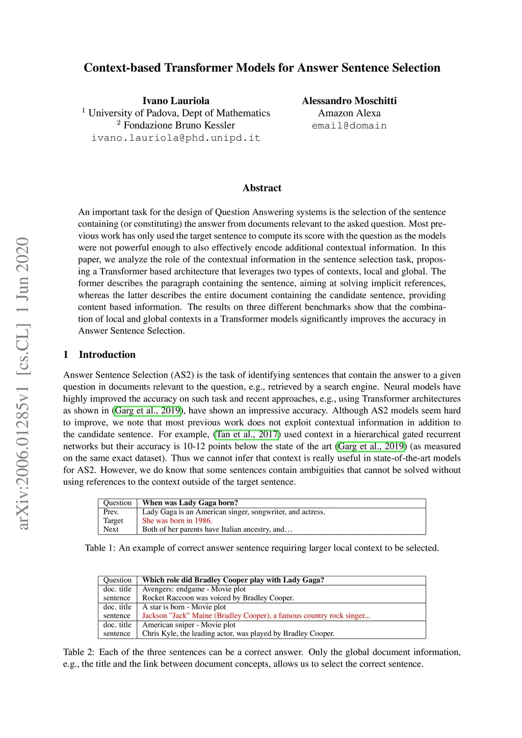 An important task for the design of Question Answering systems is the selection of the sentence containing (or constituting) the answer from documents relevant to the asked question. Most previous work has only used the target sentence to compute its score with the question as the models were not powerful enough to also effectively encode additional contextual information. In this paper, we analyze the role of the contextual information in the sentence selection task, proposing a Transformer based architecture that leverages two types of contexts, local and global. The former describes the paragraph containing the sentence, aiming at solving implicit references, whereas the latter describes the entire document containing the candidate sentence, providing content-based information. The results on three different benchmarks show that the combination of local and global contexts in a Transformer model significantly improves the accuracy in Answer Sentence Selection.