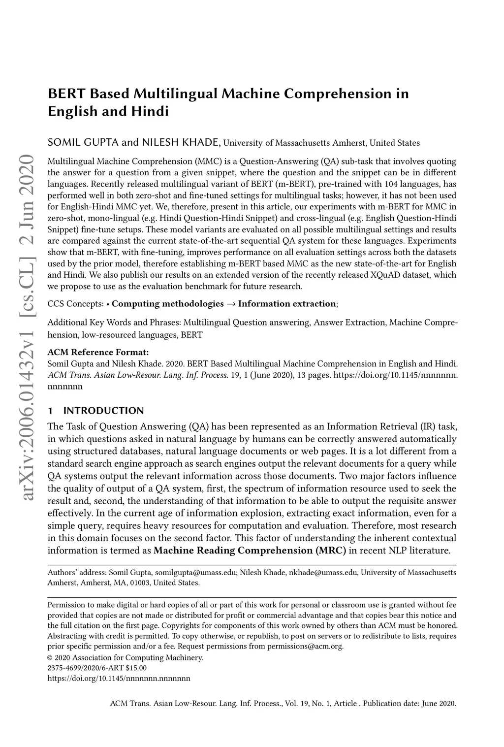 BERT Based Multilingual Machine Comprehension in English and Hindi