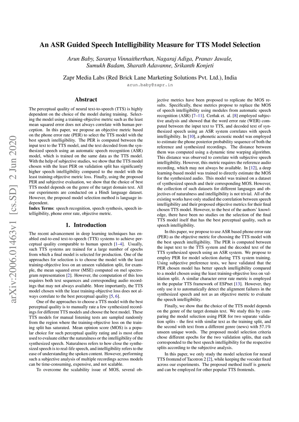 The perceptual quality of neural text-to-speech (TTS) is highly dependent on the choice of the model during training. Selecting the model using a training-objective metric such as the least mean squared error does not always correlate with human perception. In this paper, we propose an objective metric based on the phone error rate (PER) to select the TTS model with the best speech intelligibility. The PER is computed between the input text to the TTS model, and the text decoded from the synthesized speech using an automatic speech recognition (ASR) model, which is trained on the same data as the TTS model. With the help of subjective studies, we show that the TTS model chosen with the least PER on validation split has significantly higher speech intelligibility compared to the model with the least training-objective metric loss. Finally, using the proposed PER and subjective evaluation, we show that the choice of best TTS model depends on the genre of the target domain text. All our experiments are conducted on a Hindi language dataset. However, the proposed model selection method is language independent.