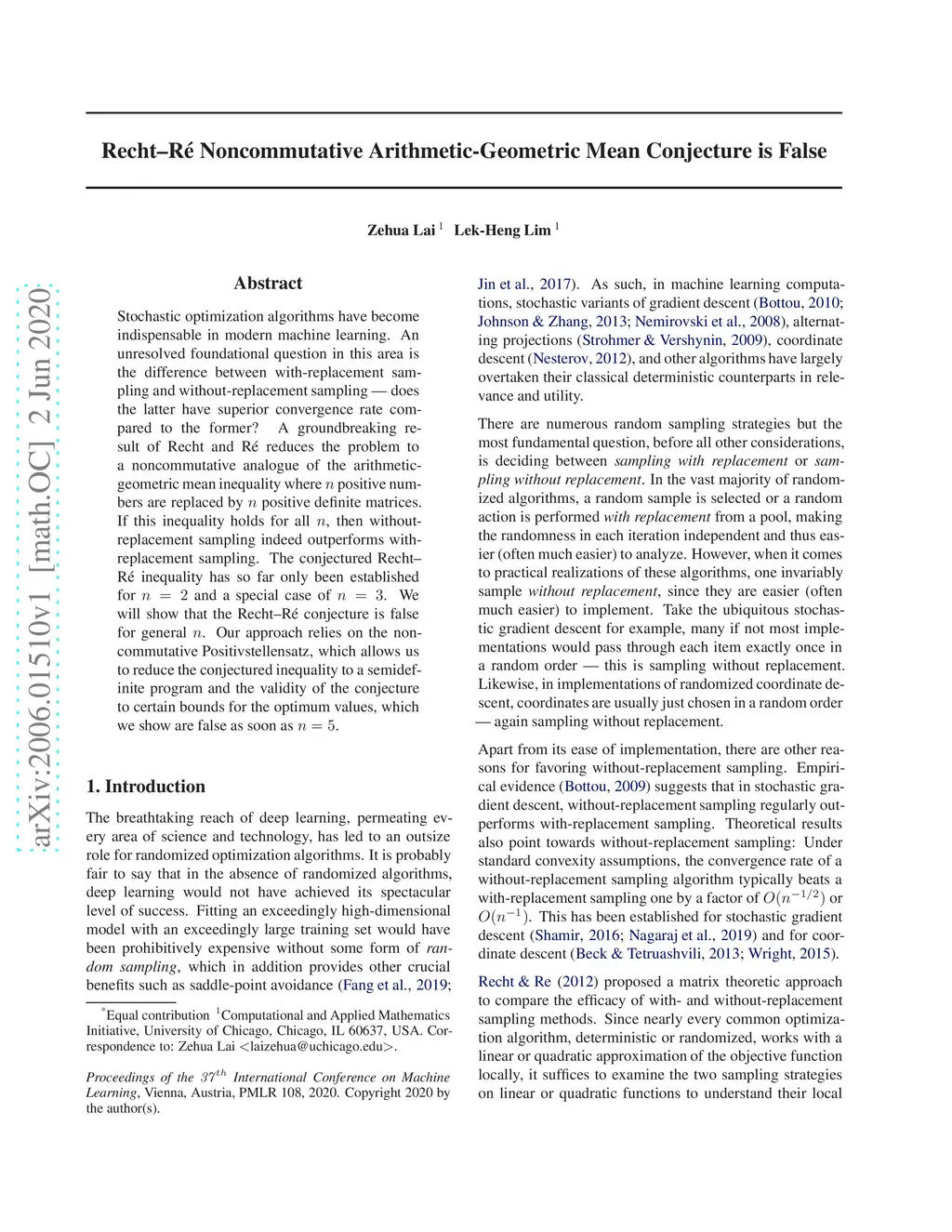 Stochastic optimization algorithms have become indispensable in modern machine learning. An unresolved foundational question in this area is the difference between with-replacement sampling and without-replacement sampling -- does the latter have superior convergence rate compared to the former? A groundbreaking result of Recht and R\é reduces the problem to a noncommutative analogue of the arithmetic-geometric mean inequality where positive numbers are replaced by positive definite matrices. If this inequality holds for all , then without-replacement sampling indeed outperforms with-replacement sampling. The conjectured Recht-R\é inequality has so far only been established for and a special case of . We will show that the Recht-R\é conjecture is false for general . Our approach relies on the noncommutative Positivstellensatz, which allows us to reduce the conjectured inequality to a semidefinite program and the validity of the conjecture to certain bounds for the optimum values, which we show are false as soon as .