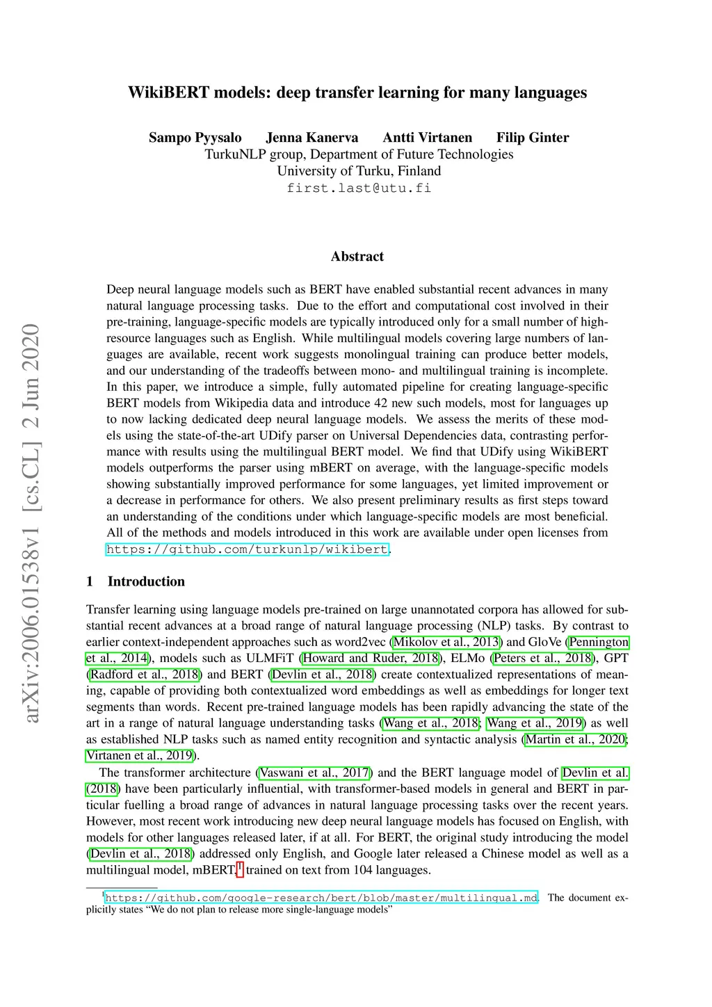 Deep neural language models such as BERT have enabled substantial recent advances in many natural language processing tasks. Due to the effort and computational cost involved in their pre-training, language-specific models are typically introduced only for a small number of high-resource languages such as English. While multilingual models covering large numbers of languages are available, recent work suggests monolingual training can produce better models, and our understanding of the tradeoffs between mono- and multilingual training is incomplete. In this paper, we introduce a simple, fully automated pipeline for creating language-specific BERT models from Wikipedia data and introduce 42 new such models, most for languages up to now lacking dedicated deep neural language models. We assess the merits of these models using the state-of-the-art UDify parser on Universal Dependencies data, contrasting performance with results using the multilingual BERT model. We find that UDify using WikiBERT models outperforms the parser using mBERT on average, with the language-specific models showing substantially improved performance for some languages, yet limited improvement or a decrease in performance for others. We also present preliminary results as first steps toward an understanding of the conditions under which language-specific models are most beneficial. All of the methods and models introduced in this work are available under open licenses from https://github.com/turkunlp/wikibert.
