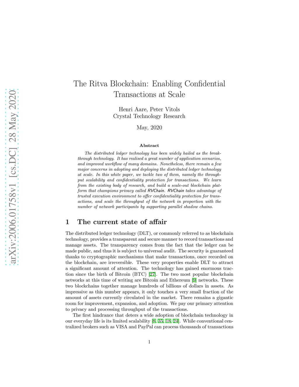 The distributed ledger technology has been widely hailed as the break-through technology. It has realised a great number of application scenarios, and improved workflow of many domains. Nonetheless, there remain a few major concerns in adopting and deploying the distributed ledger technology at scale. In this white paper, we tackle two of them, namely the throughput scalability and confidentiality protection for transactions. We learn from the existing body of research, and build a scale-out blockchain platform that champions privacy called RVChain. RVChain takes advantage of trusted execution environment to offer confidentiality protection for transactions, and scales the throughput of the network in proportion with the number of network participants by supporting parallel shadow chains.