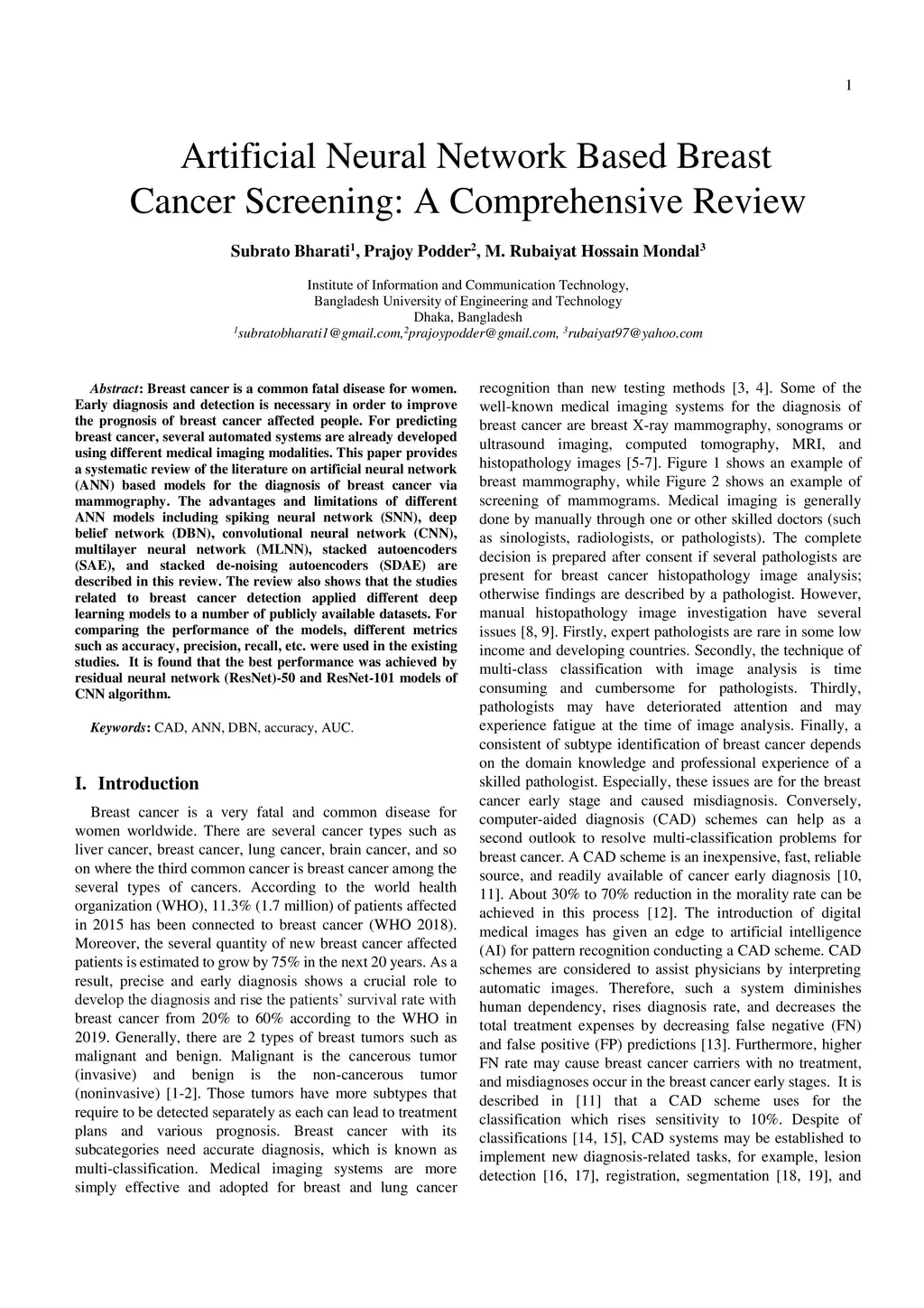 Artificial Neural Network Based Breast Cancer Screening: A Comprehensive