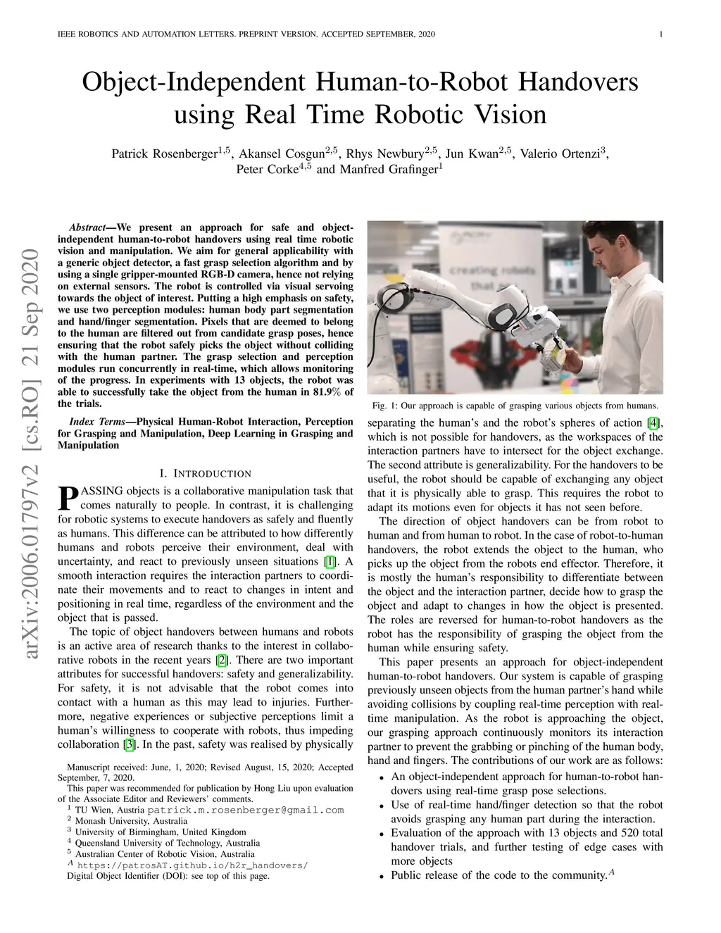 Object-Independent Human-to-Robot Handovers using Real Time Robotic