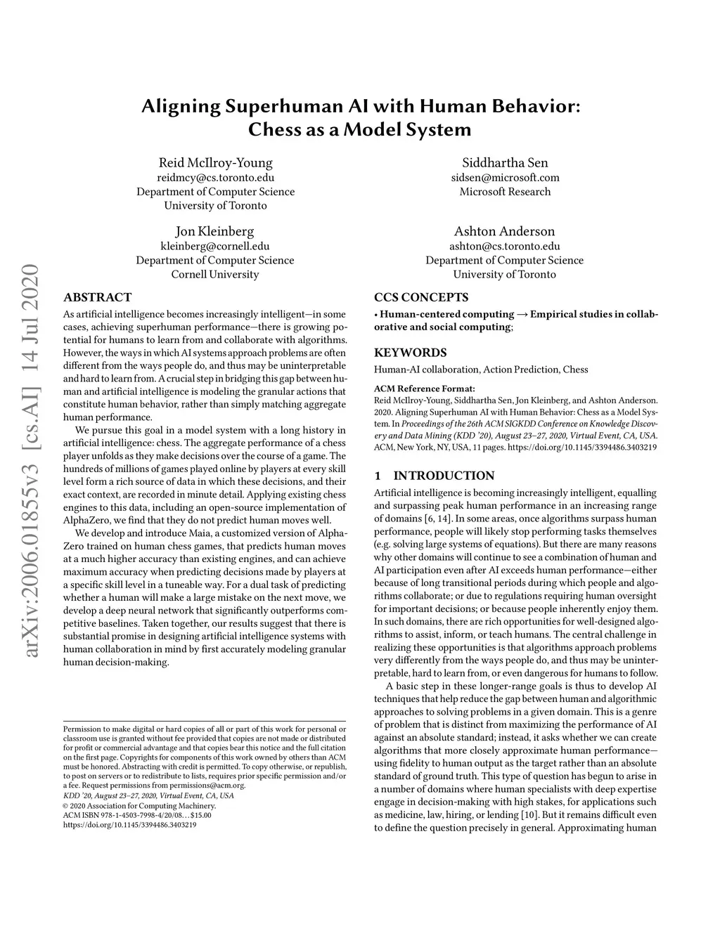 As artificial intelligence becomes increasingly intelligent---in some cases, achieving superhuman performance---there is growing potential for humans to learn from and collaborate with algorithms. However, the ways in which AI systems approach problems are often different from the ways people do, and thus may be uninterpretable and hard to learn from. A crucial step in bridging this gap between human and artificial intelligence is modeling the granular actions that constitute human behavior, rather than simply matching aggregate human performance. We pursue this goal in a model system with a long history in artificial intelligence: chess. The aggregate performance of a chess player unfolds as they make decisions over the course of a game. The hundreds of millions of games played online by players at every skill level form a rich source of data in which these decisions, and their exact context, are recorded in minute detail. Applying existing chess engines to this data, including an open-source implementation of AlphaZero, we find that they do not predict human moves well. We develop and introduce Maia, a customized version of Alpha-Zero trained on human chess games, that predicts human moves at a much higher accuracy than existing engines, and can achieve maximum accuracy when predicting decisions made by players at a specific skill level in a tuneable way. For a dual task of predicting whether a human will make a large mistake on the next move, we develop a deep neural network that significantly outperforms competitive baselines. Taken together, our results suggest that there is substantial promise in designing artificial intelligence systems with human collaboration in mind by first accurately modeling granular human decision-making.