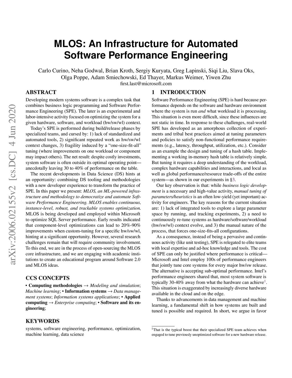 Developing modern systems software is a complex task that combines business logic programming and Software Performance Engineering (SPE). The later is an experimental and labor-intensive activity focused on optimizing the system for a given hardware, software, and workload (hw/sw/wl) context. Today's SPE is performed during build/release phases by specialized teams, and cursed by: 1) lack of standardized and automated tools, 2) significant repeated work as hw/sw/wl context changes, 3) fragility induced by a "one-size-fit-all" tuning (where improvements on one workload or component may impact others). The net result: despite costly investments, system software is often outside its optimal operating point - anecdotally leaving 30% to 40% of performance on the table. The recent developments in Data Science (DS) hints at an opportunity: combining DS tooling and methodologies with a new developer experience to transform the practice of SPE. In this paper we present: MLOS, an ML-powered infrastructure and methodology to democratize and automate Software Performance Engineering. MLOS enables continuous, instance-level, robust, and trackable systems optimization. MLOS is being developed and employed within Microsoft to optimize SQL Server performance. Early results indicated that component-level optimizations can lead to 20%-90% improvements when custom-tuning for a specific hw/sw/wl, hinting at a significant opportunity. However, several research challenges remain that will require community involvement. To this end, we are in the process of open-sourcing the MLOS core infrastructure, and we are engaging with academic institutions to create an educational program around Software 2.0 and MLOS ideas.