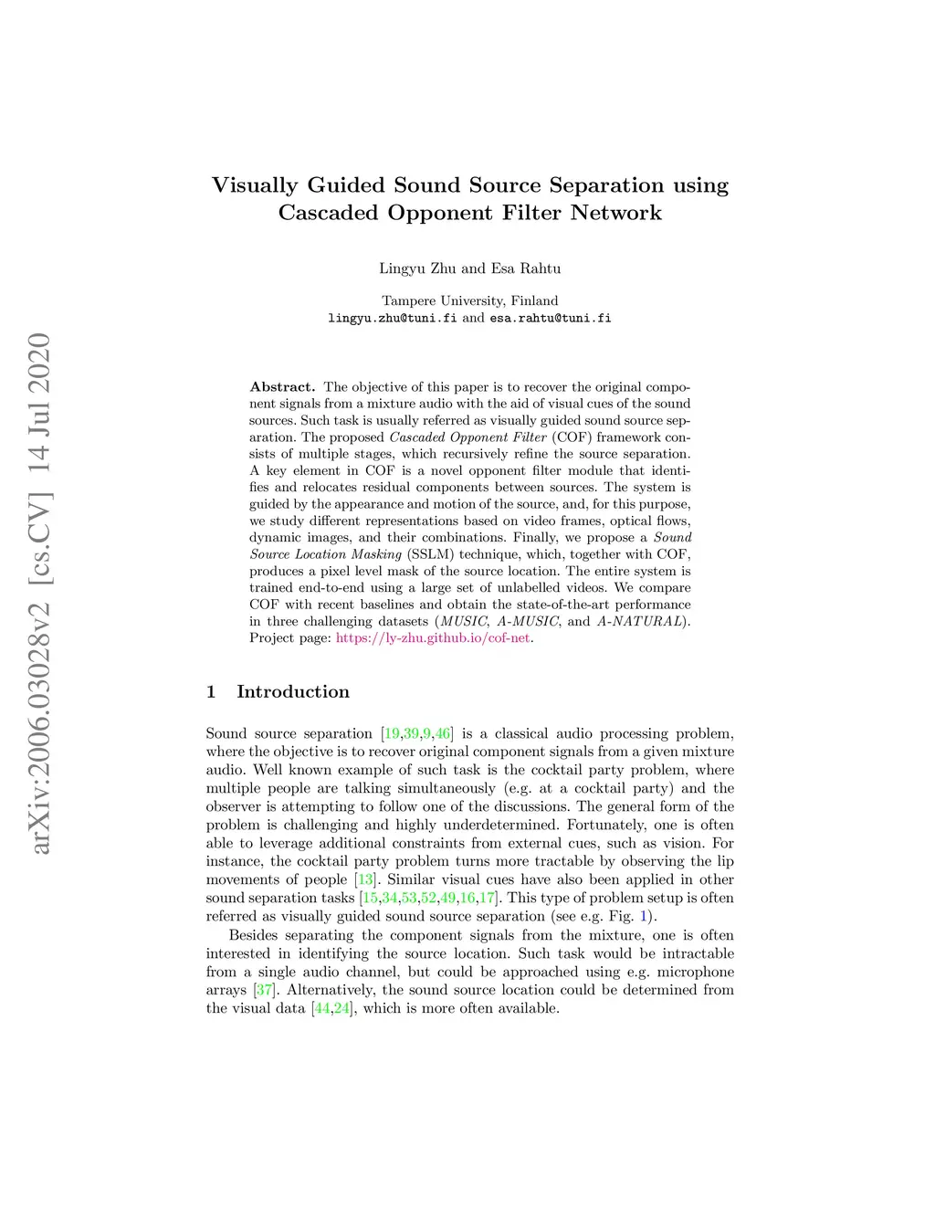 Visually Guided Sound Source Separation using Cascaded Opponent Filter