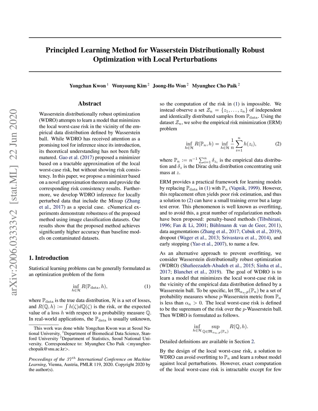Wasserstein distributionally robust optimization (WDRO) attempts to learn a model that minimizes the local worst-case risk in the vicinity of the empirical data distribution defined by Wasserstein ball. While WDRO has received attention as a promising tool for inference since its introduction, its theoretical understanding has not been fully matured. Gao et al. (2017) proposed a minimizer based on a tractable approximation of the local worst-case risk, but without showing risk consistency. In this paper, we propose a minimizer based on a novel approximation theorem and provide the corresponding risk consistency results. Furthermore, we develop WDRO inference for locally perturbed data that include the Mixup (Zhang et al., 2017) as a special case. We show that our approximation and risk consistency results naturally extend to the cases when data are locally perturbed. Numerical experiments demonstrate robustness of the proposed method using image classification datasets. Our results show that the proposed method achieves significantly higher accuracy than baseline models on noisy datasets.