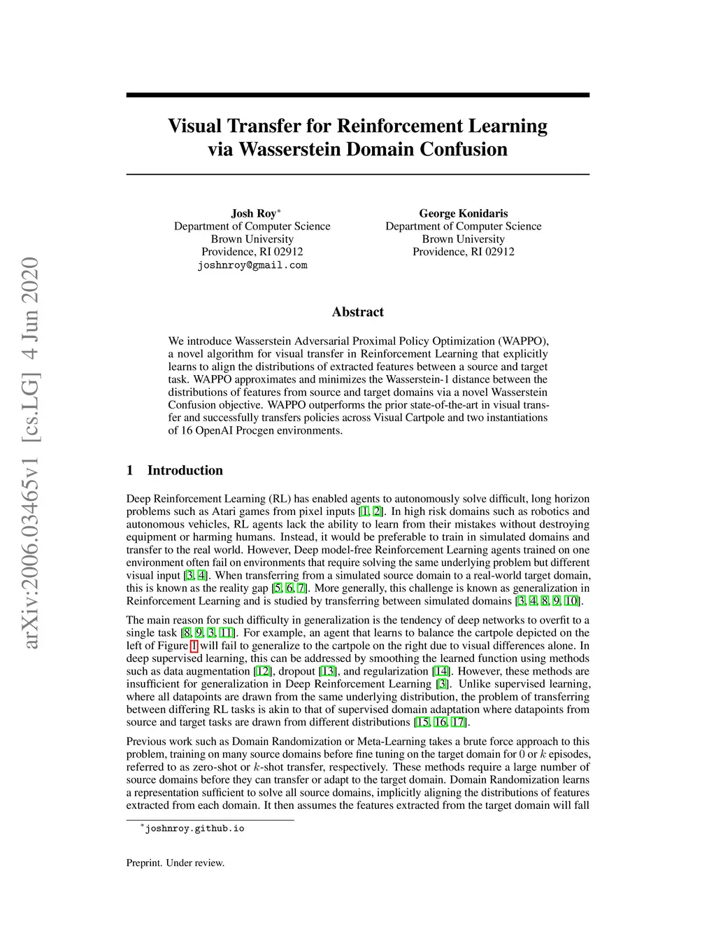We introduce Wasserstein Adversarial Proximal Policy Optimization (WAPPO), a novel algorithm for visual transfer in Reinforcement Learning that explicitly learns to align the distributions of extracted features between a source and target task. WAPPO approximates and minimizes the Wasserstein-1 distance between the distributions of features from source and target domains via a novel Wasserstein Confusion objective. WAPPO outperforms the prior state-of-the-art in visual transfer and successfully transfers policies across Visual Cartpole and two instantiations of 16 OpenAI Procgen environments.