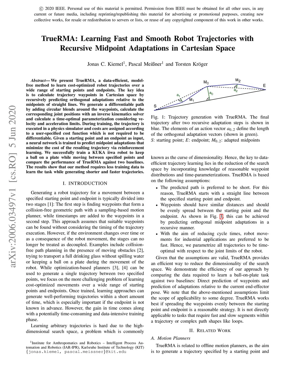 We present TrueRMA, a data-efficient, model-free method to learn cost-optimized robot trajectories over a wide range of starting points and endpoints. The key idea is to calculate trajectory waypoints in Cartesian space by recursively predicting orthogonal adaptations relative to the midpoints of straight lines. We generate a differentiable path by adding circular blends around the waypoints, calculate the corresponding joint positions with an inverse kinematics solver and calculate a time-optimal parameterization considering velocity and acceleration limits. During training, the trajectory is executed in a physics simulator and costs are assigned according to a user-specified cost function which is not required to be differentiable. Given a starting point and an endpoint as input, a neural network is trained to predict midpoint adaptations that minimize the cost of the resulting trajectory via reinforcement learning. We successfully train a KUKA iiwa robot to keep a ball on a plate while moving between specified points and compare the performance of TrueRMA against two baselines. The results show that our method requires less training data to learn the task while generating shorter and faster trajectories.