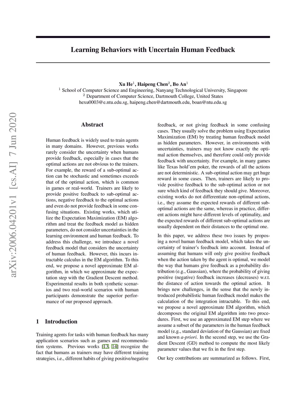 Human feedback is widely used to train agents in many domains. However, previous works rarely consider the uncertainty when humans provide feedback, especially in cases that the optimal actions are not obvious to the trainers. For example, the reward of a sub-optimal action can be stochastic and sometimes exceeds that of the optimal action, which is common in games or real-world. Trainers are likely to provide positive feedback to sub-optimal actions, negative feedback to the optimal actions and even do not provide feedback in some confusing situations. Existing works, which utilize the Expectation Maximization (EM) algorithm and treat the feedback model as hidden parameters, do not consider uncertainties in the learning environment and human feedback. To address this challenge, we introduce a novel feedback model that considers the uncertainty of human feedback. However, this incurs intractable calculus in the EM algorithm. To this end, we propose a novel approximate EM algorithm, in which we approximate the expectation step with the Gradient Descent method. Experimental results in both synthetic scenarios and two real-world scenarios with human participants demonstrate the superior performance of our proposed approach.